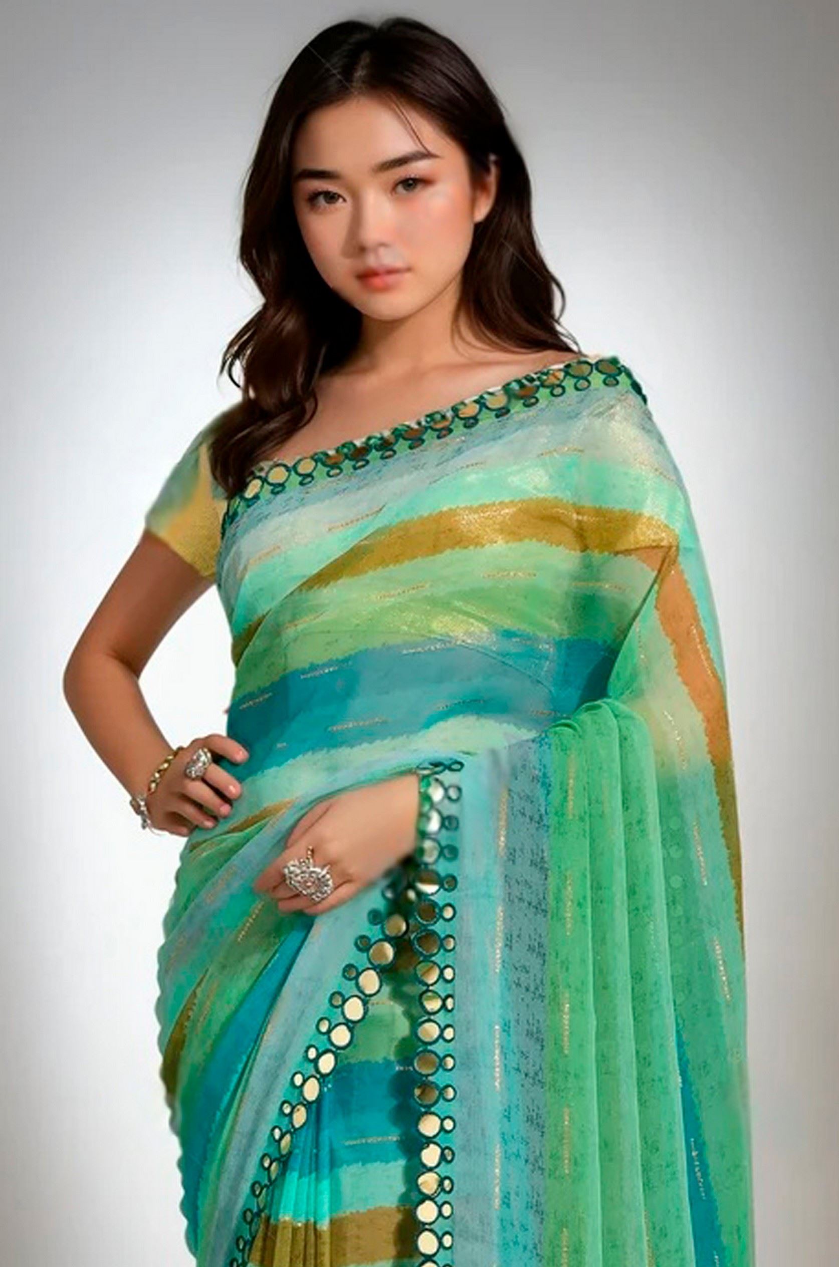 The refreshing green hue brings a natural elegance, making it a versatile choice for both daytime and evening occasions. This saree comes with a matching green art silk blouse, which complements the saree with its subtle shine and smooth finish, creating a well-coordinated and stylish ensemble. The combination of printed design and mirror detailing makes this saree ideal for those who love a modern ethnic look with a hint of tradition.
