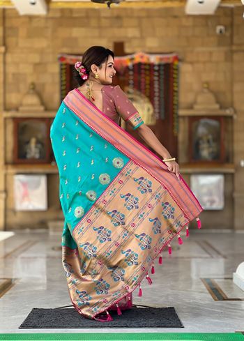 The serene green hue combined with the intricate Paithani-style woven Jacquard work adds an opulent charm, making it ideal for weddings, festivals, and cultural gatherings. The saree comes with a contrasting pink silk blend blouse, giving it a vibrant and stylish look. Its delicate woven detailing highlights the timeless artistry of Paithani weaving, making this saree a true statement piece.