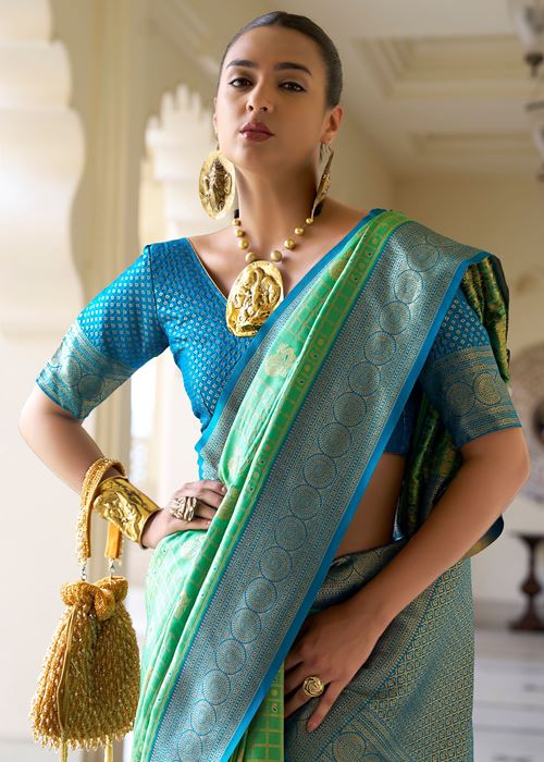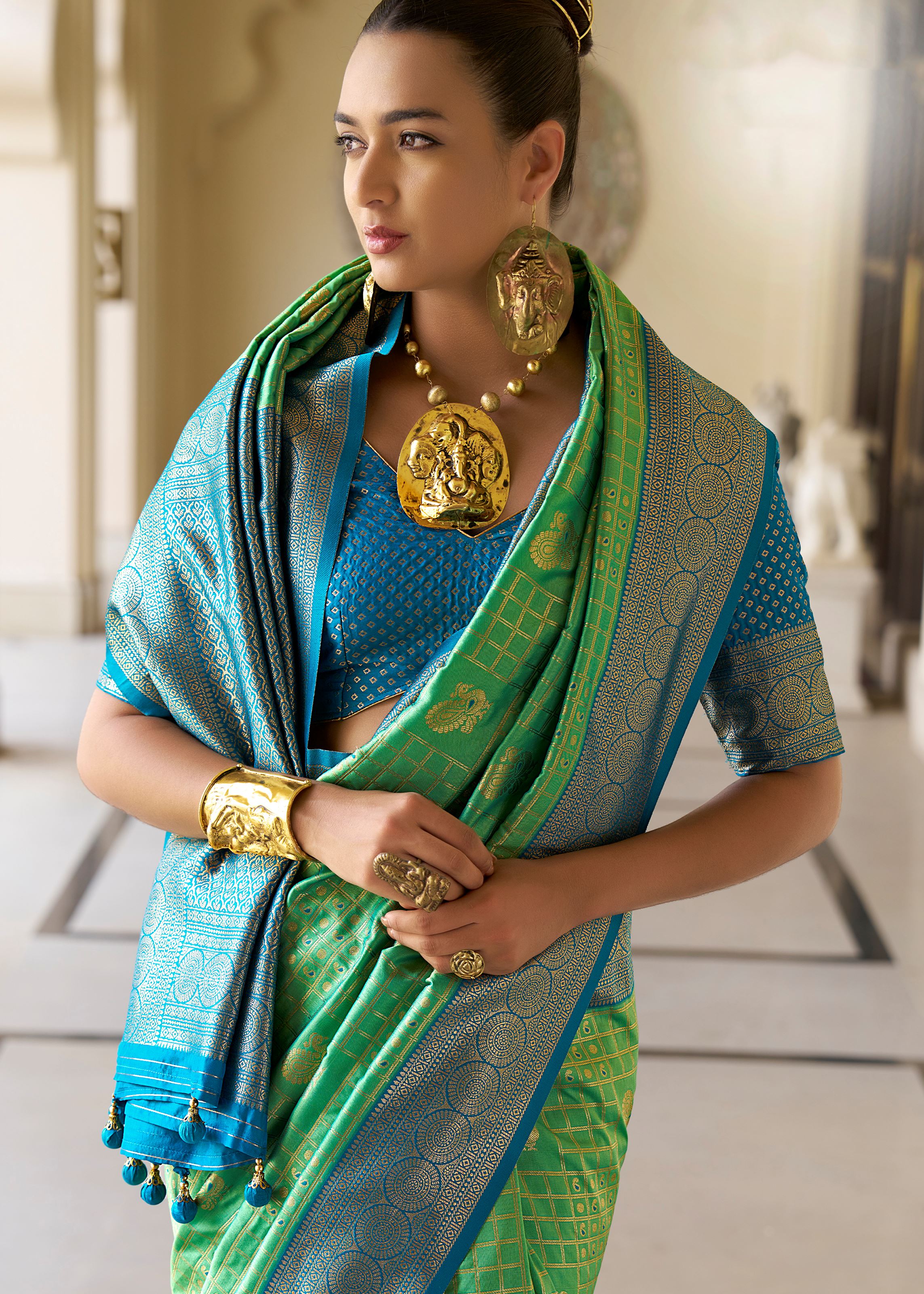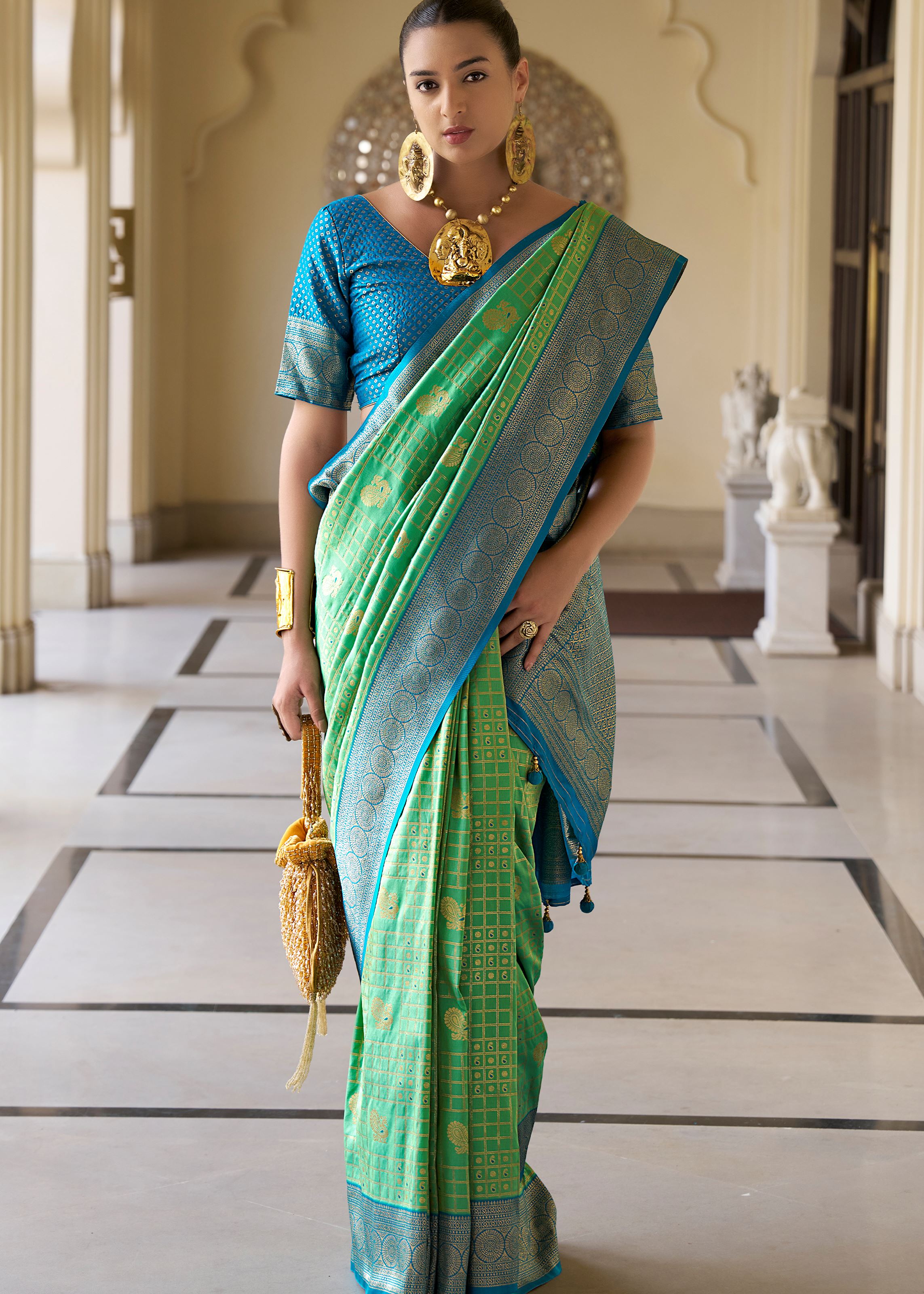 Rama Green Silk Blend Saree With Jacquard Woven Work