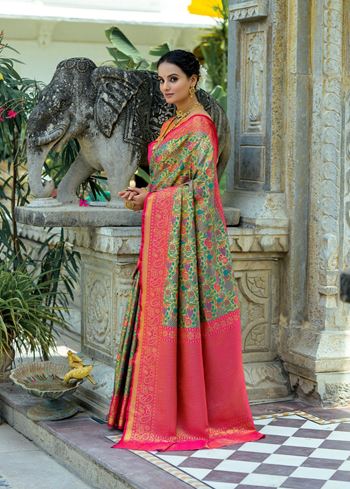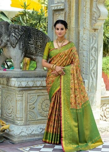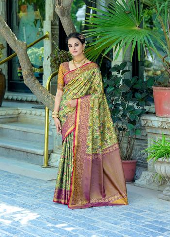 Intricate zari work delicately adorns the saree, creating a radiant interplay of patterns and textures. The pallu is a masterpiece in itself—lavishly woven with gold-toned zari motifs that echo the legacy of timeless South Indian weaving. The accompanying mahendi green blouse, fashioned in matching Kanjivaram silk, enhances the overall harmony and depth of the ensemble.