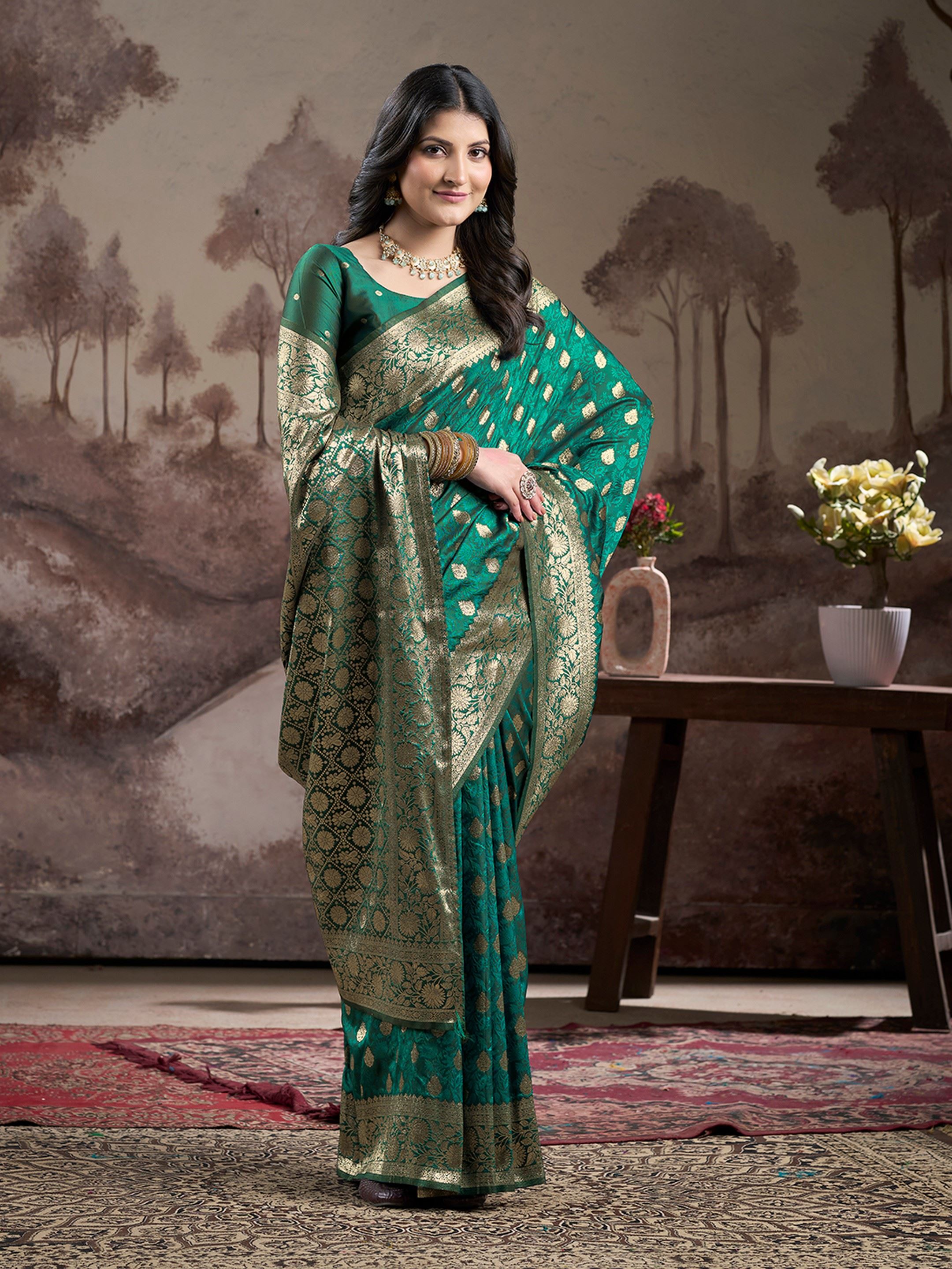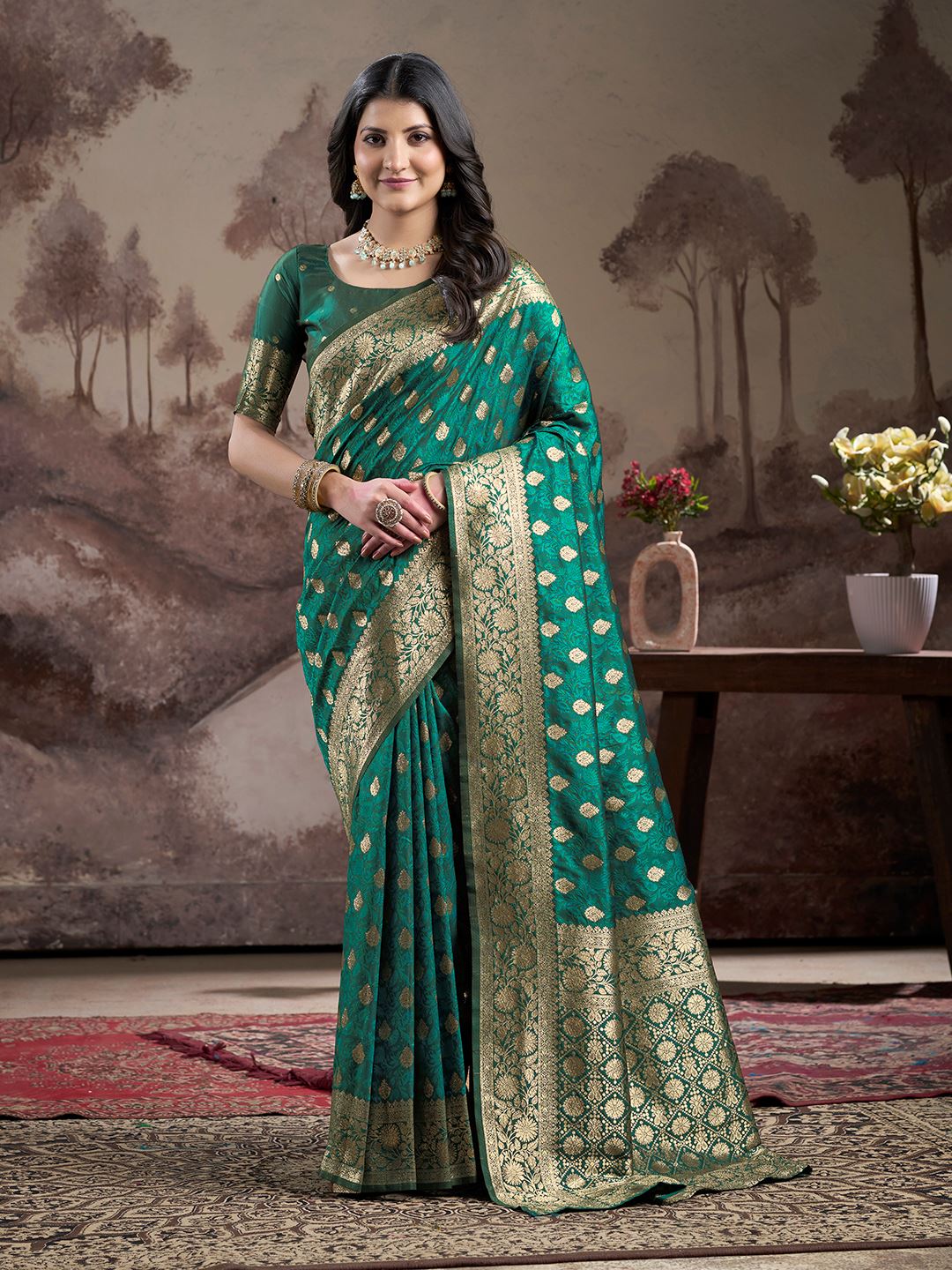Paired with a matching green art silk blouse, the ensemble creates a harmonious and elegant look. The detailed woven motifs and rich pallu highlight expert artistry, blending heritage weaving techniques with modern fashion aesthetics. Lightweight yet opulent, this saree ensures comfort while making a bold and stylish statement at festive occasions, receptions, or ceremonial events.