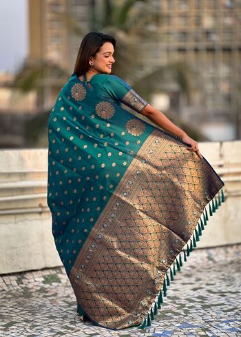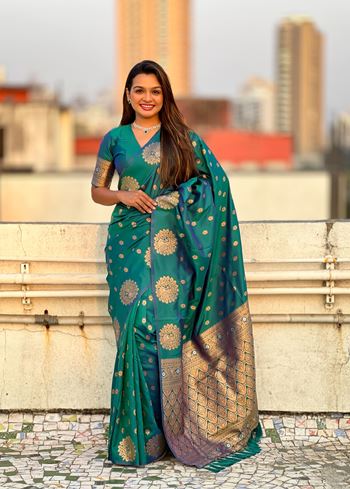 Paired with a matching green silk blend blouse, this saree forms a harmonious and regal ensemble. The vibrant green hue exudes freshness and sophistication, while the detailed woven patterns highlight the elegance and grandeur of the design. Ideal for festive occasions and cultural events, this designer saree ensures you make a lasting impression with timeless style.