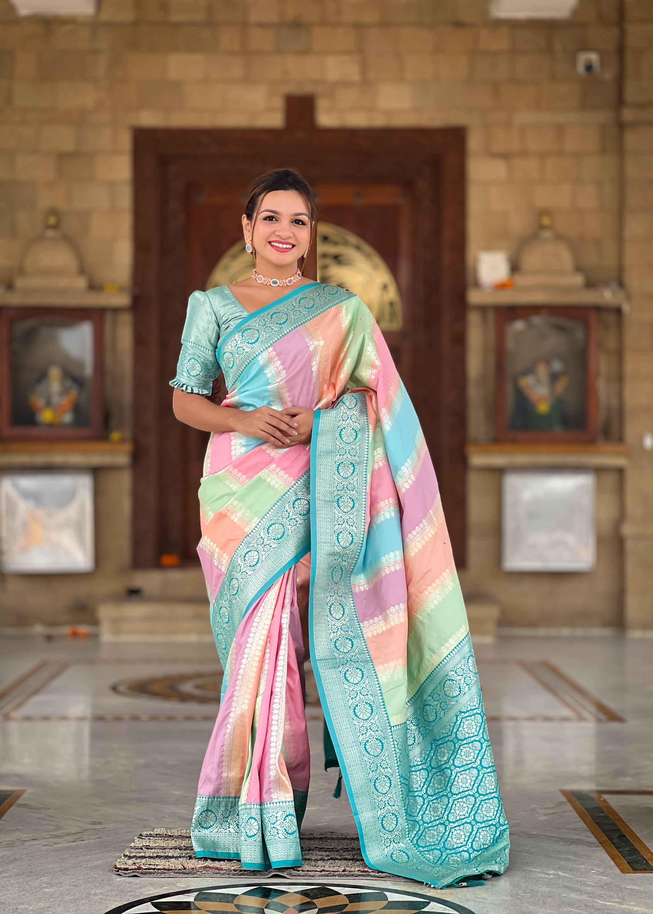 Adorned with intricate woven Jacquard work, this saree exudes classic artistry and royal appeal. It comes with a matching silk blend blouse in green, allowing easy customization for your preferred style. Whether you’re looking for traditional sarees for festive occasions, ethnic wear for weddings, or designer silk sarees, this piece is an absolute must-have.