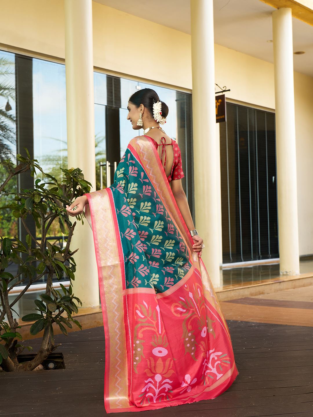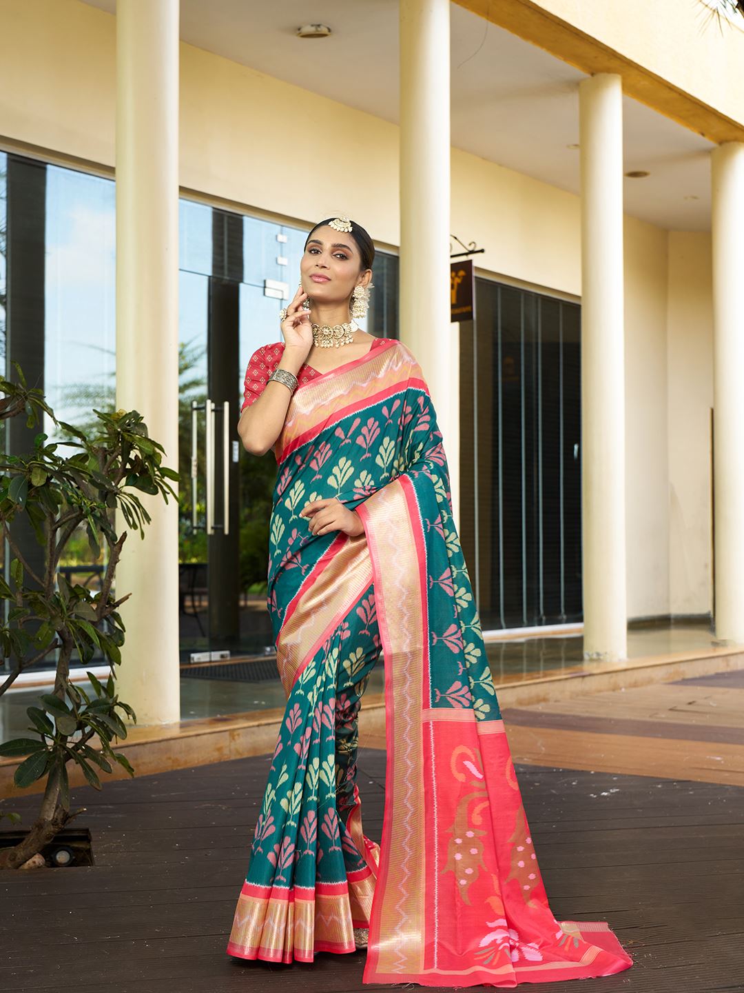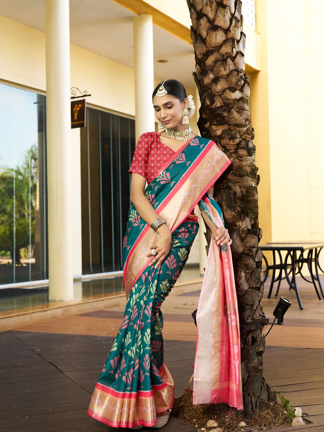 Add a vibrant touch to your festive wardrobe with the Rama Trendy Crepe Saree With Woven Zari Patta And Designer Print Work, exclusively from Aethnofit Fashions. Crafted from premium crepe fabric, this saree combines lightweight comfort with contemporary elegance, making it perfect for weddings, parties, festive occasions, and special celebrations. The rich green base is beautifully adorned with intricate woven zari patta and designer print work, offering a unique blend of traditional artistry and modern style.