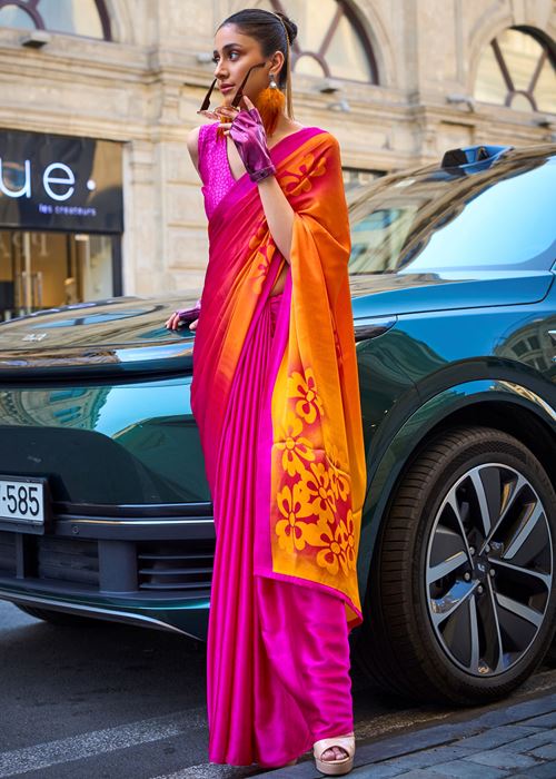 Rani Pink & Mustard Satin Crepe Saree With Digital Print