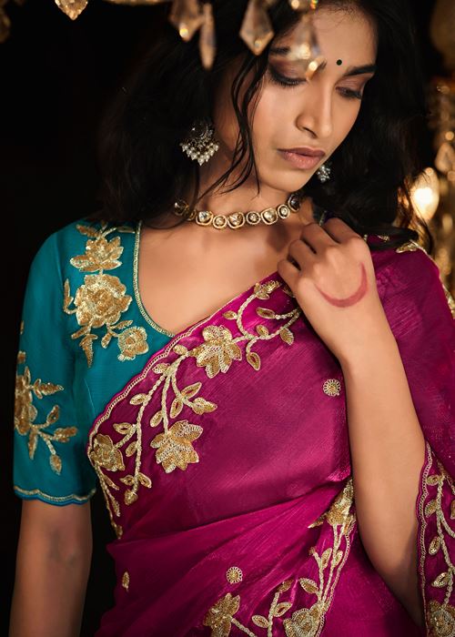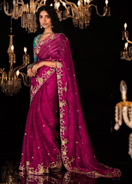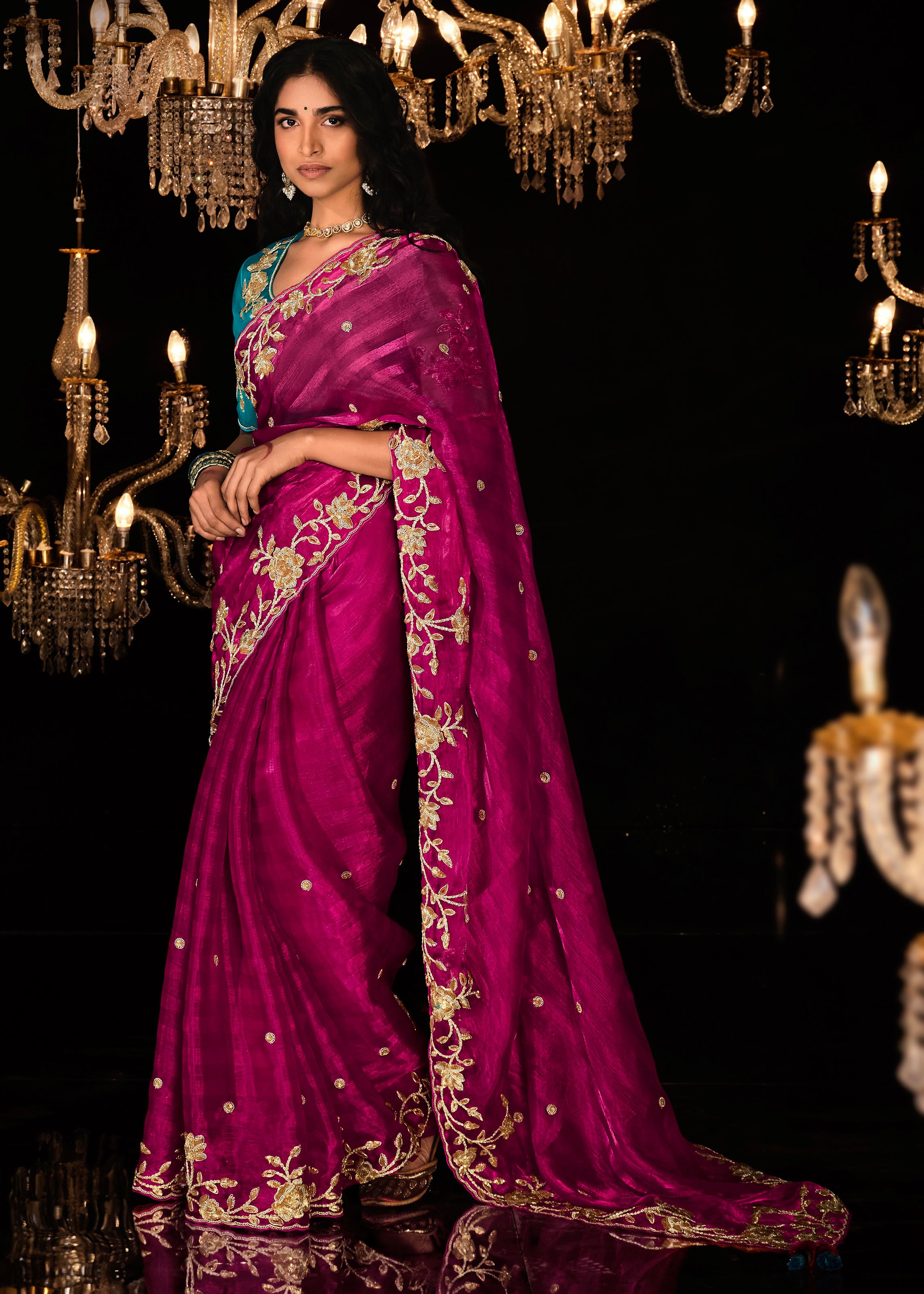 Rani Pink Fancy Fabric Saree With Heavy Thread Embroidery, Zarkan, Stone With Sequins Work