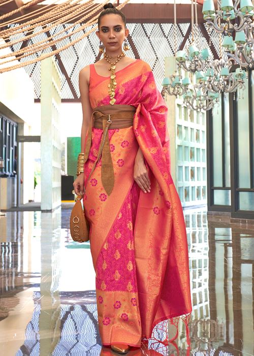 Rani Pink Handloom Silk Saree With Jacquard Woven Work