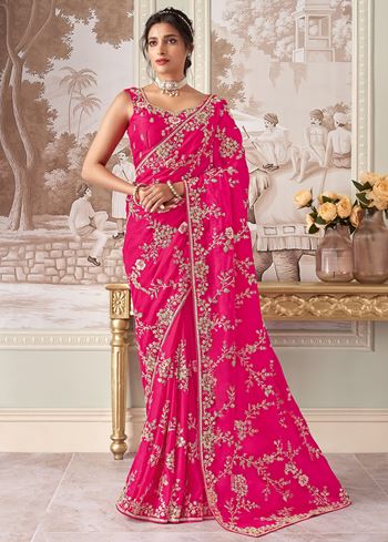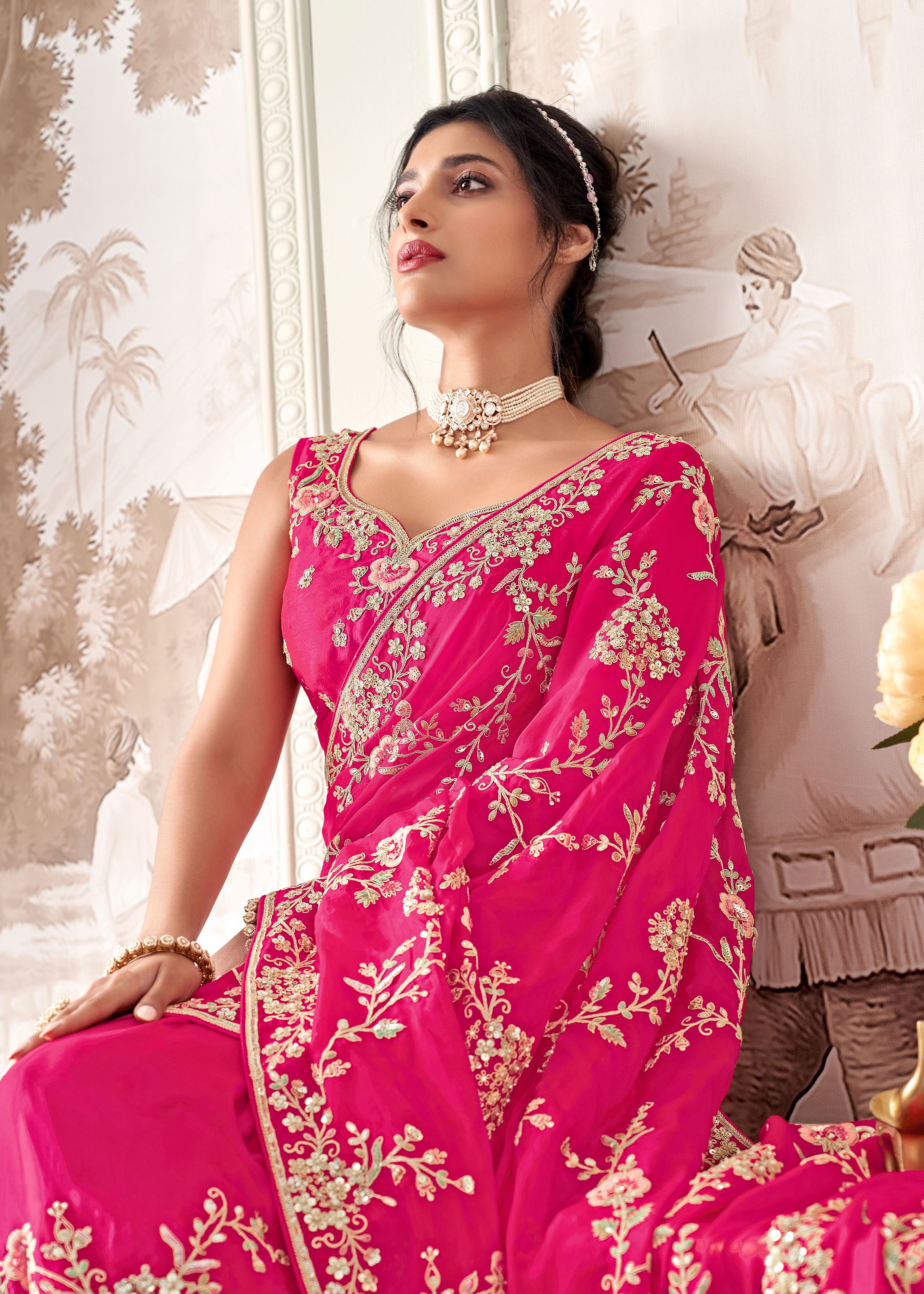 Rani Pink Organza Saree With Heavy Thread Embroidery, Zari and Sequins Work
