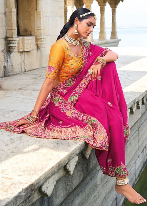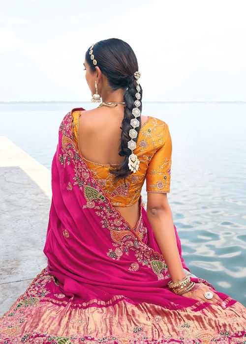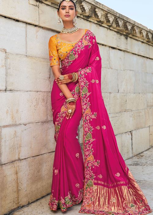 Rani Pink Pure Gaji Satin Saree With Thread Embroidery Zari, Cut-Dana, Moti With Jarkhan Heavy Work