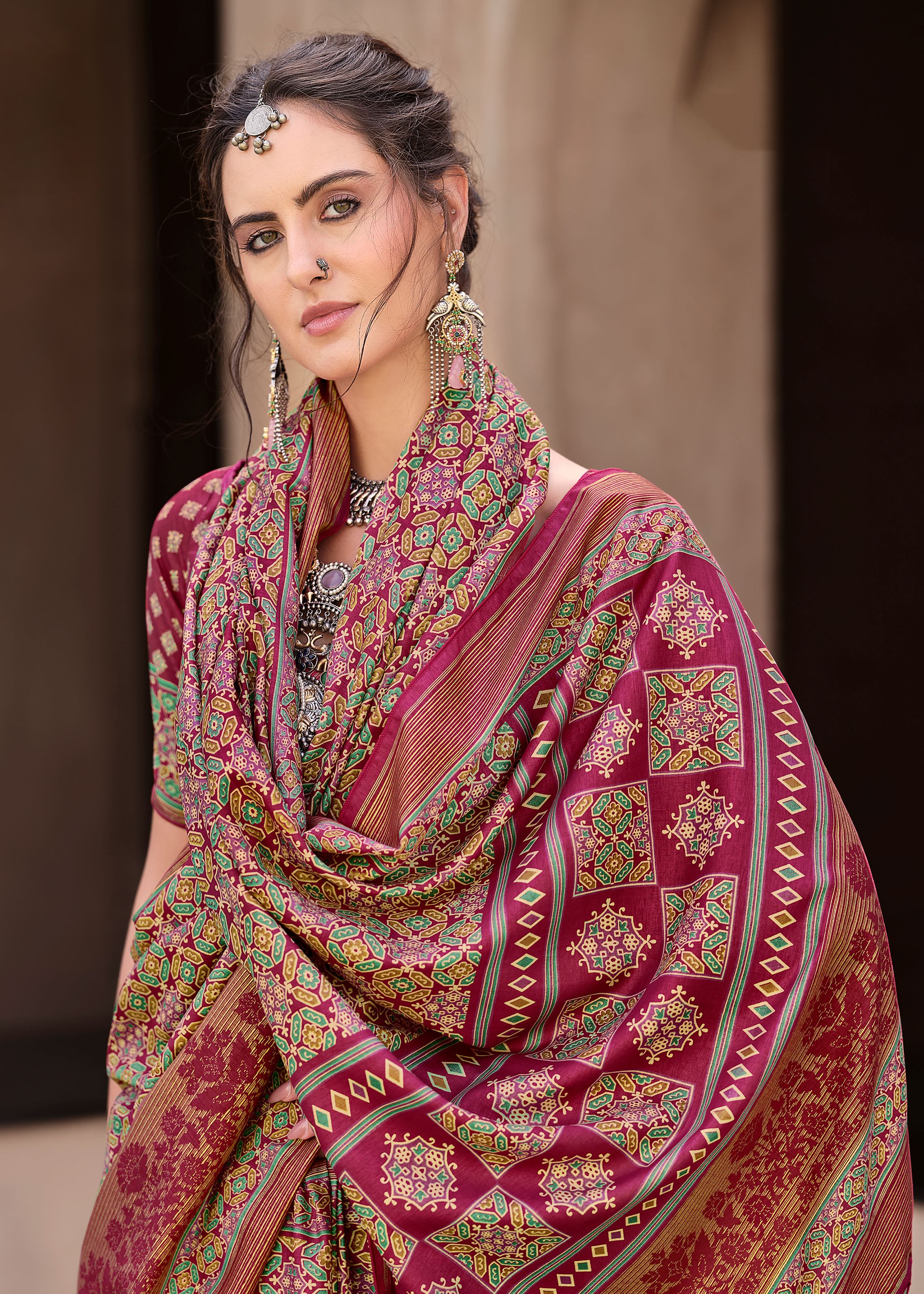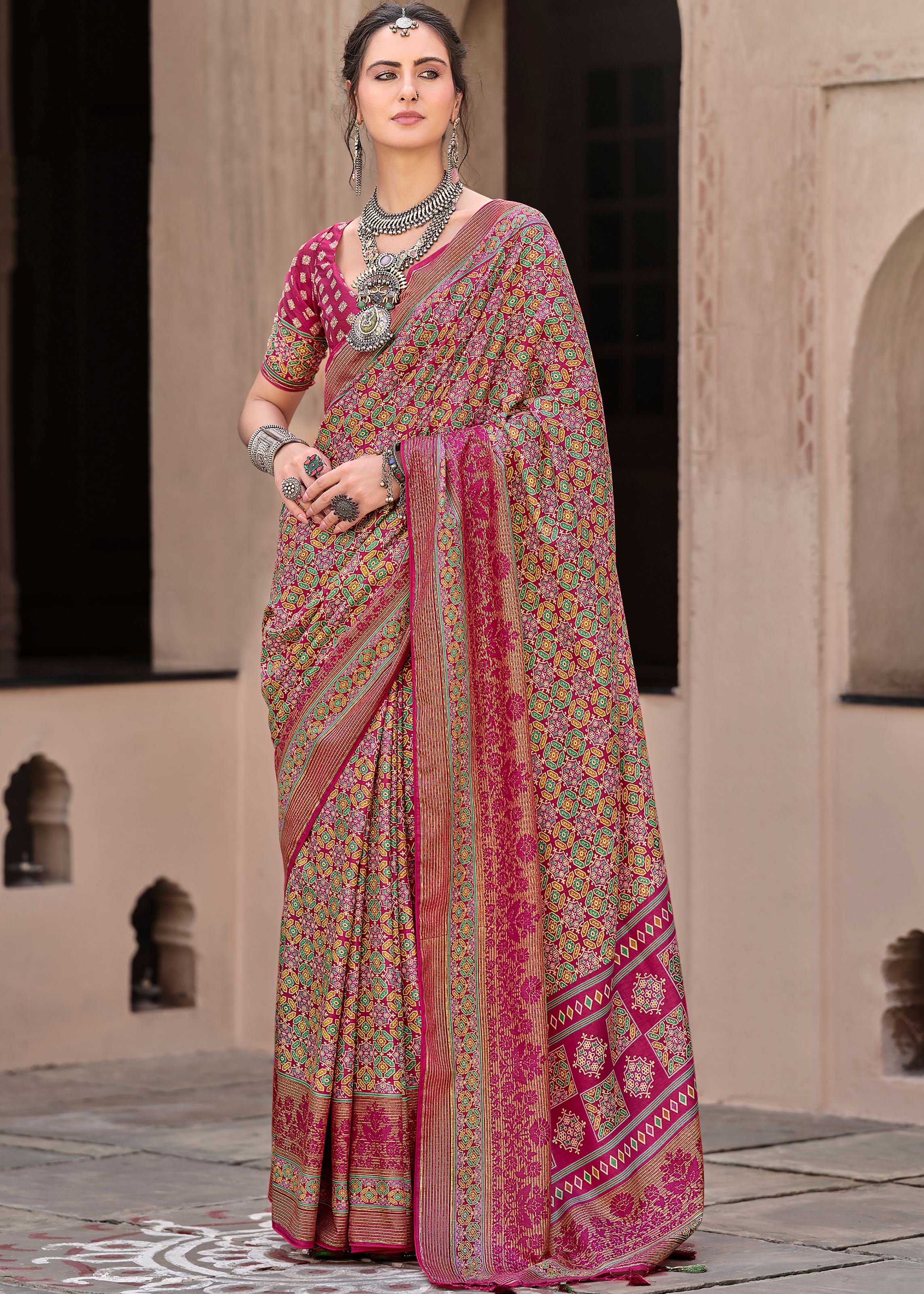 Rani Pink Silk Saree With Ajrakh Print