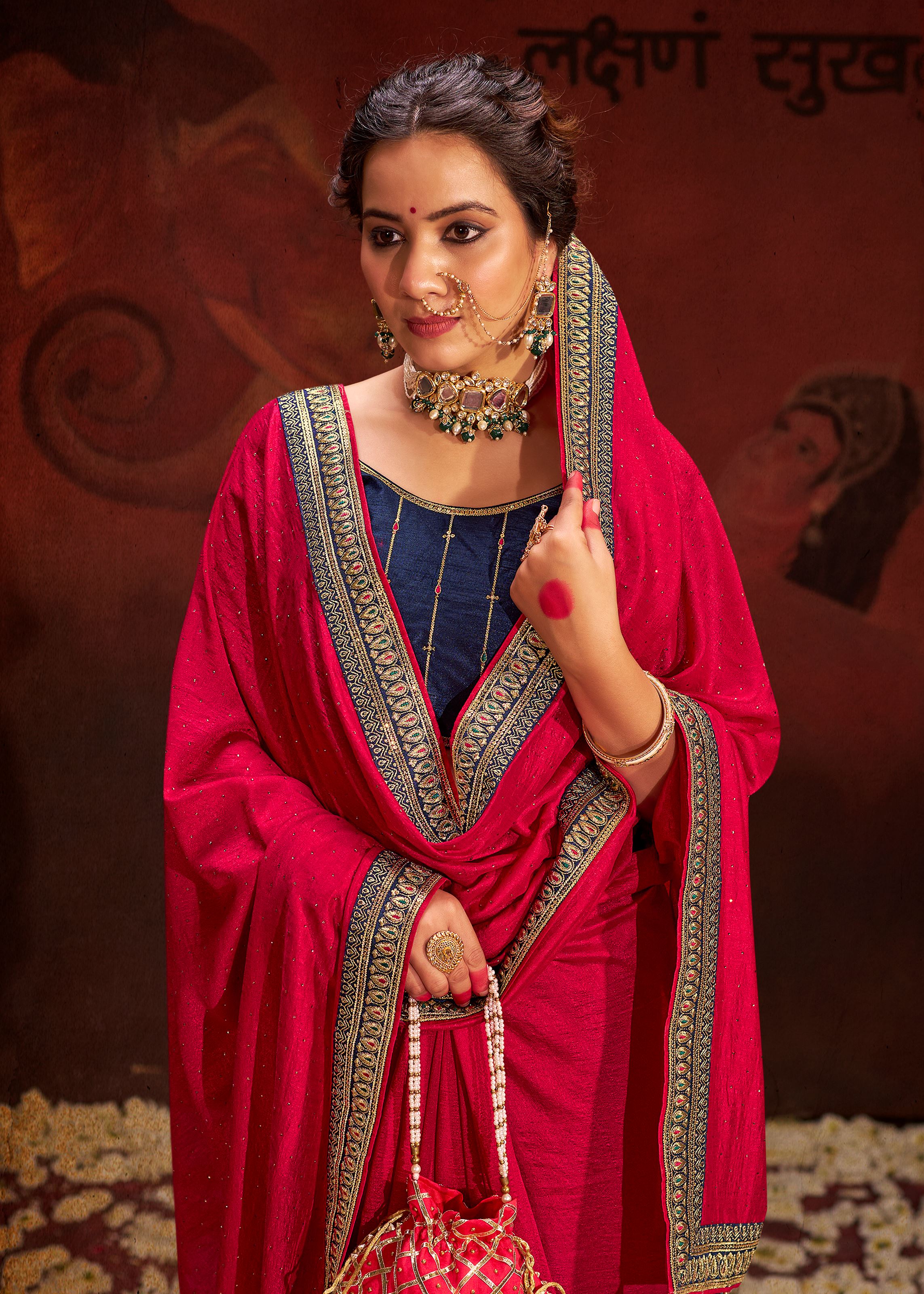 Rani Pink Vichitra Silk Saree With Heavy Diamond Work and Embroidery Lace Border