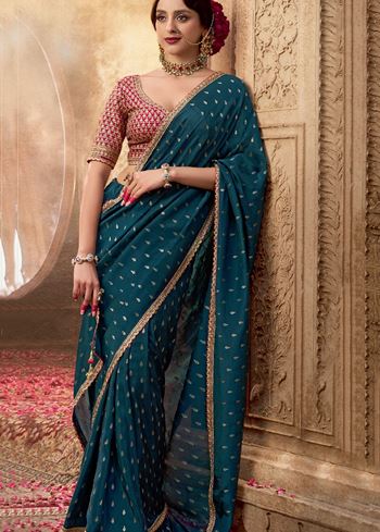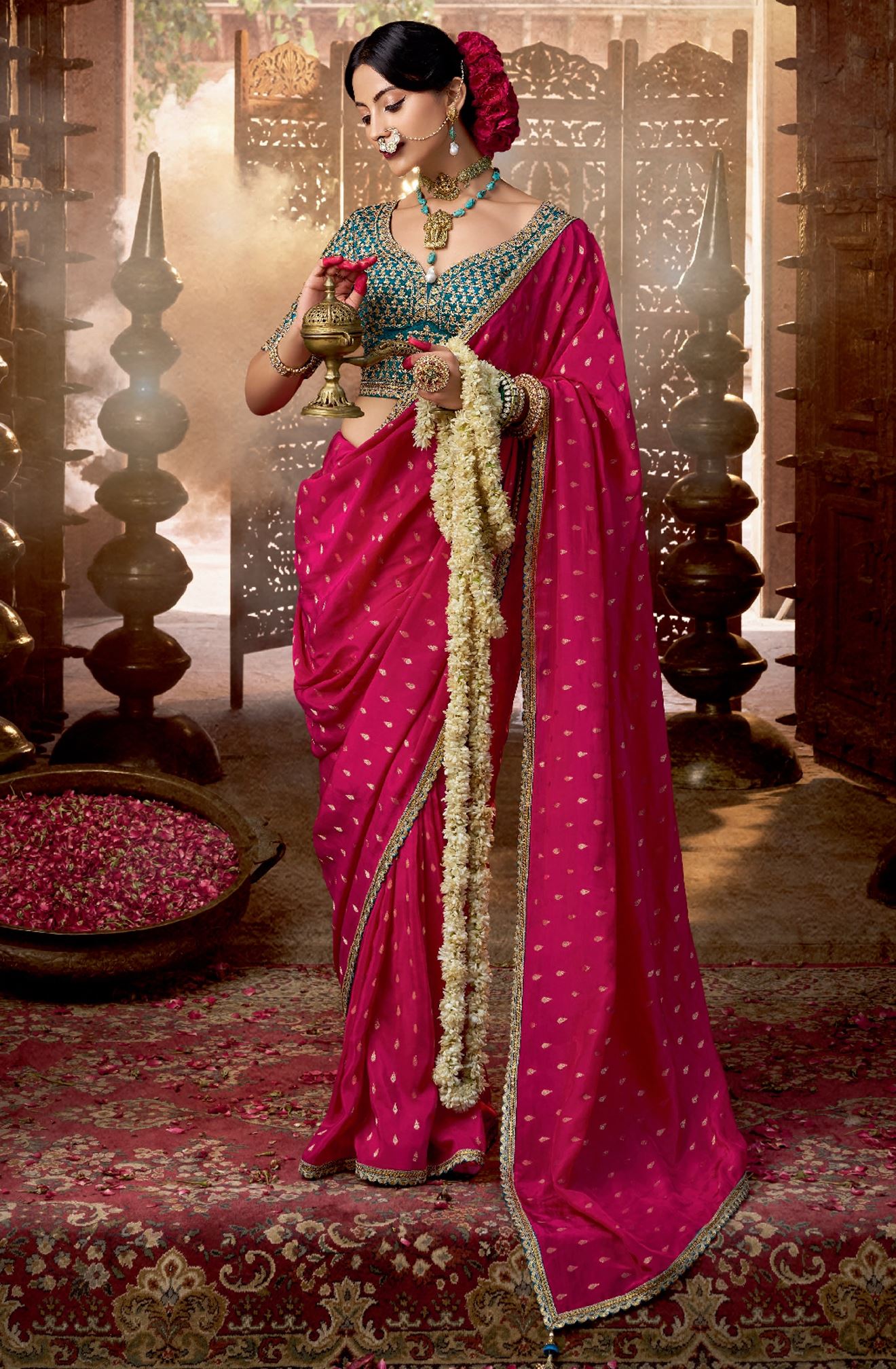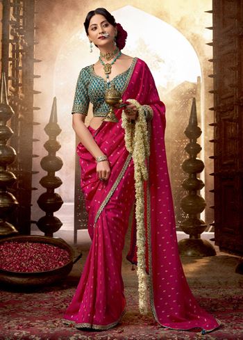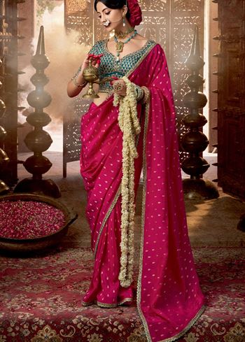 Paired with a teal pure viscose crepe blouse featuring exquisite embroidery, this ensemble creates a striking contrast that enhances the vibrant rani pink shade. The soft, flowing fabric drapes effortlessly, providing a refined silhouette that combines style with comfort. Ideal for bridal functions, parties, or traditional gatherings, this saree ensures a polished and sophisticated appearance.