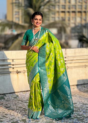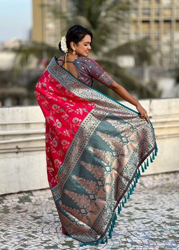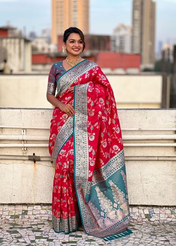 The vibrant red base is beautifully contrasted by a teal silk blend blouse, creating a striking and refined ensemble. Its rich fabric drapes gracefully, highlighting the detailed Banarasi weaving and Meenakari patterns while ensuring comfort and a flattering fit. Designed for women who appreciate authentic craftsmanship and traditional elegance, this designer saree makes a stunning statement at bridal functions, festive gatherings, and special celebrations.