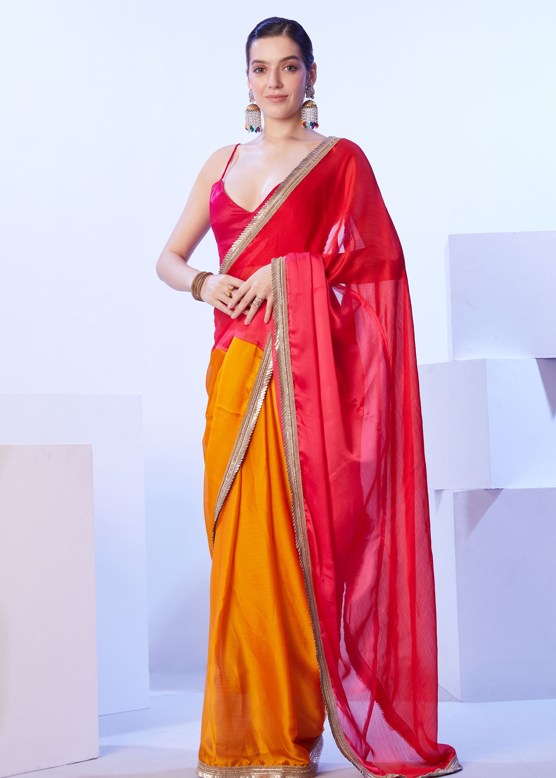 Red Beautiful Satin Moss Solid Designer Bollywood Party Saree