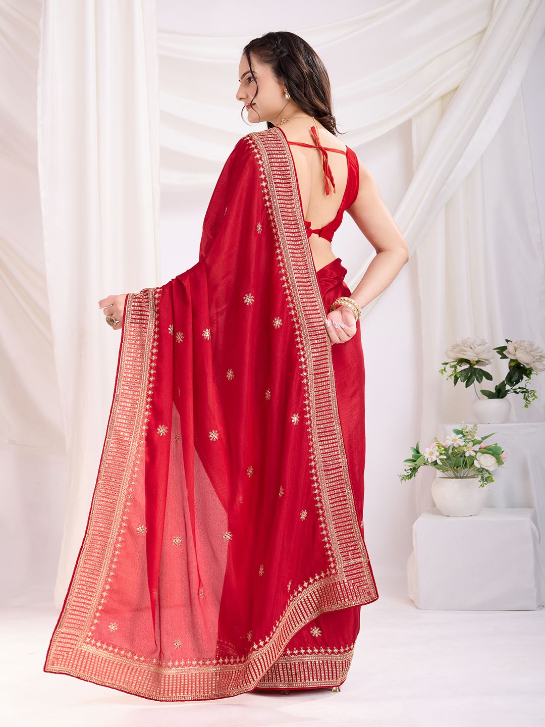 Red Chinon Silk Desigenr Zari Embroidered Ceremonial Saree