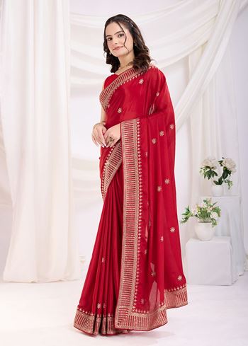 Red Chinon Silk Designer Zari Embroidered Ceremonial Saree
