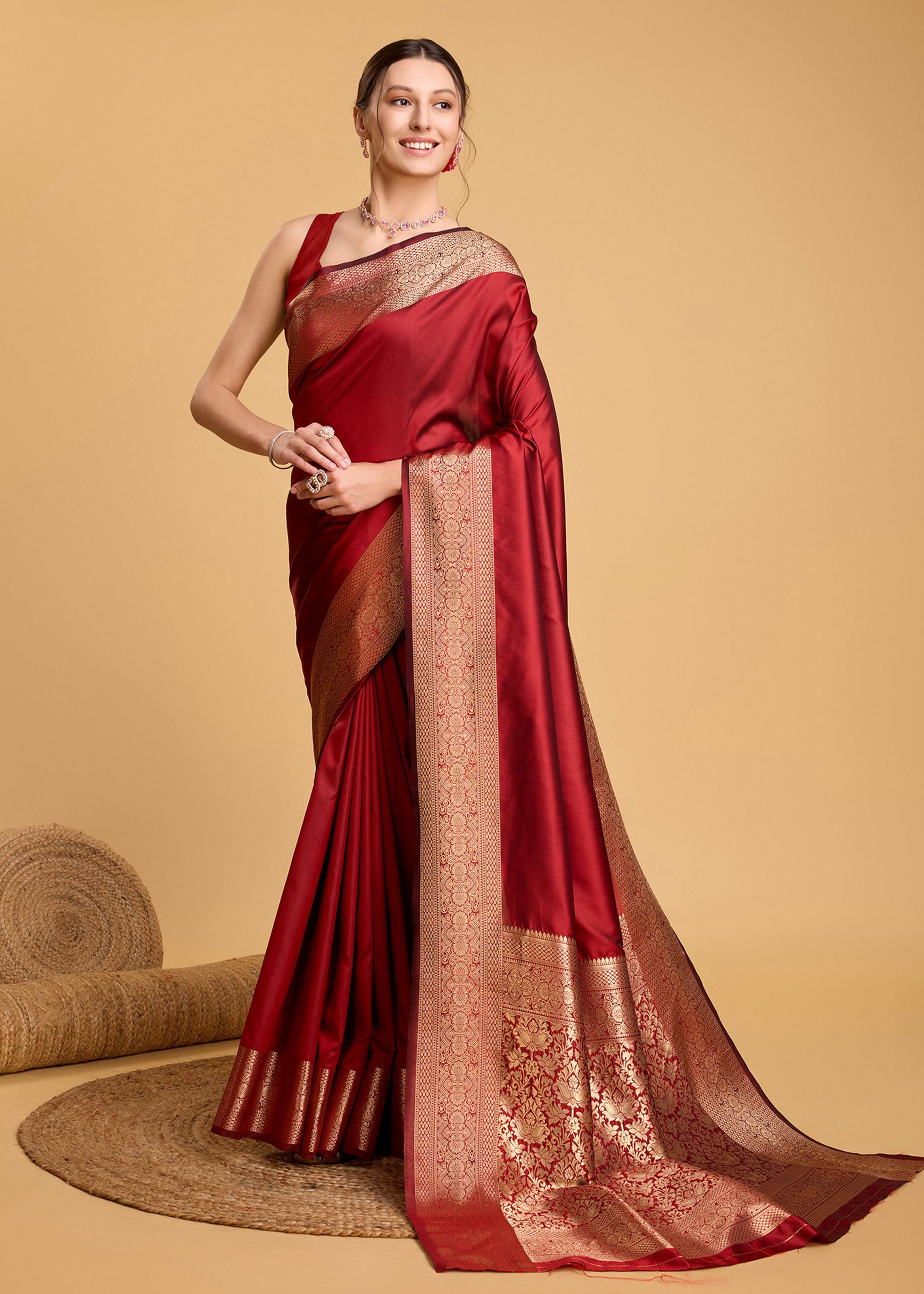 The striking red color symbolizes love, prosperity, and celebration, making it an ideal choice for weddings, festivals, and cultural gatherings. Intricately woven with golden zari motifs, the saree showcases detailed craftsmanship that adds a regal aura to your style. The shimmering zari work creates a luxurious appeal, ensuring that you capture attention effortlessly at any event.