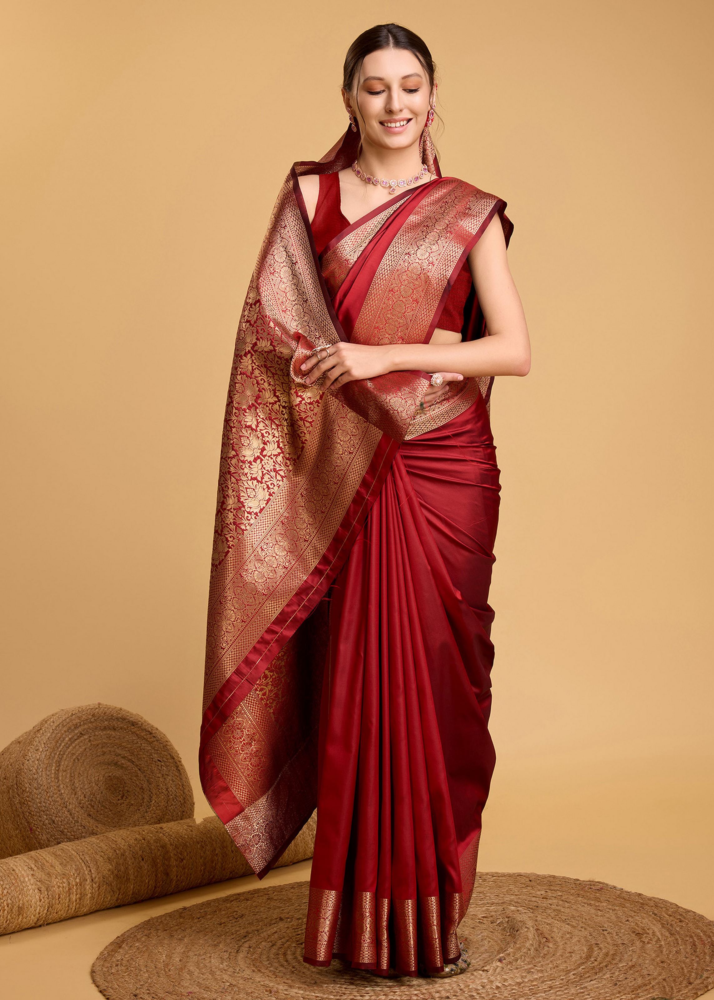Accompanied by a matching red silk blend blouse, the ensemble is designed for a cohesive and sophisticated appearance. The blouse fabric can be tailored in both traditional and contemporary cuts, giving you styling flexibility to suit your personal taste.Pair this saree with statement jewelry, embellished bangles, and heels or ethnic juttis to complete your festive look. Whether you’re attending a wedding, religious ceremony, or grand celebration, this red zari woven soft silk saree is sure to make you feel elegant, confident, and radiant.