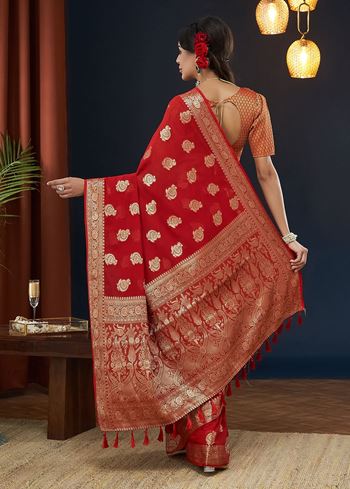 The saree is beautifully adorned with intricate zari woven work, reflecting exquisite craftsmanship and cultural heritage. Its lightweight texture ensures comfort, while the shimmering woven patterns add grandeur, making it ideal for weddings, festive gatherings, receptions, and partywear occasions. The matching red georgette blouse further enhances its designer appeal, offering a complete coordinated look that can be styled in multiple ways.