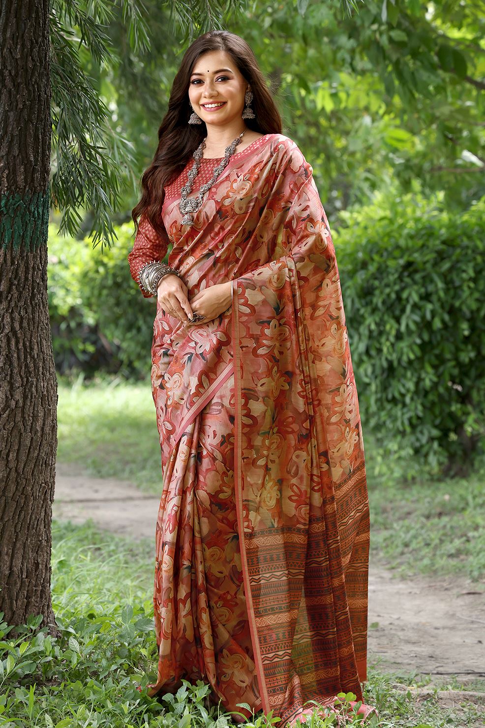 It comes paired with a matching red cotton silk blouse, allowing you to keep the styling seamless or experiment with layered jewelry, bold bangles, or a contrasting waist belt for a modern ethnic edge.