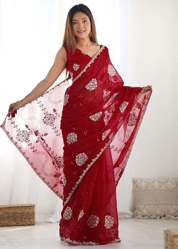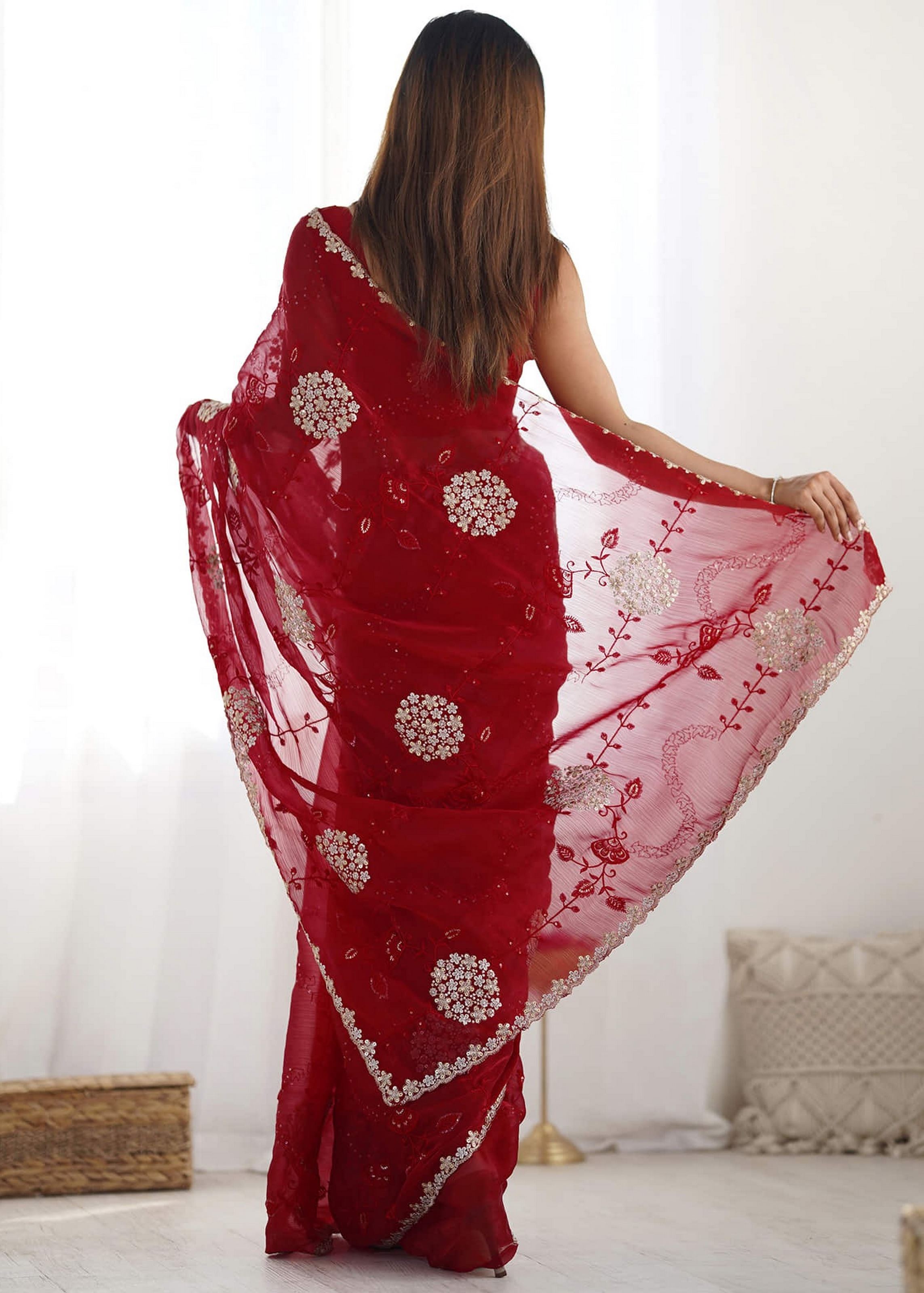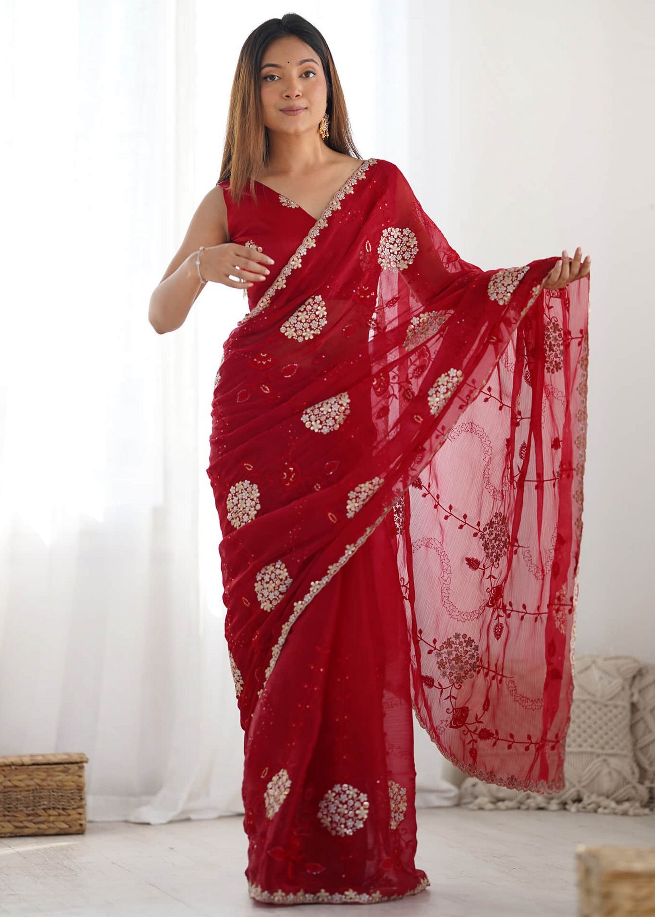 The vibrant red color symbolizes passion and grandeur, ensuring you stand out at any celebration. The saree is adorned with intricate embroidery work, showcasing fine craftsmanship and attention to detail. The matching chiffon blouse in a red hue complements the saree beautifully, creating a cohesive and stylish look.