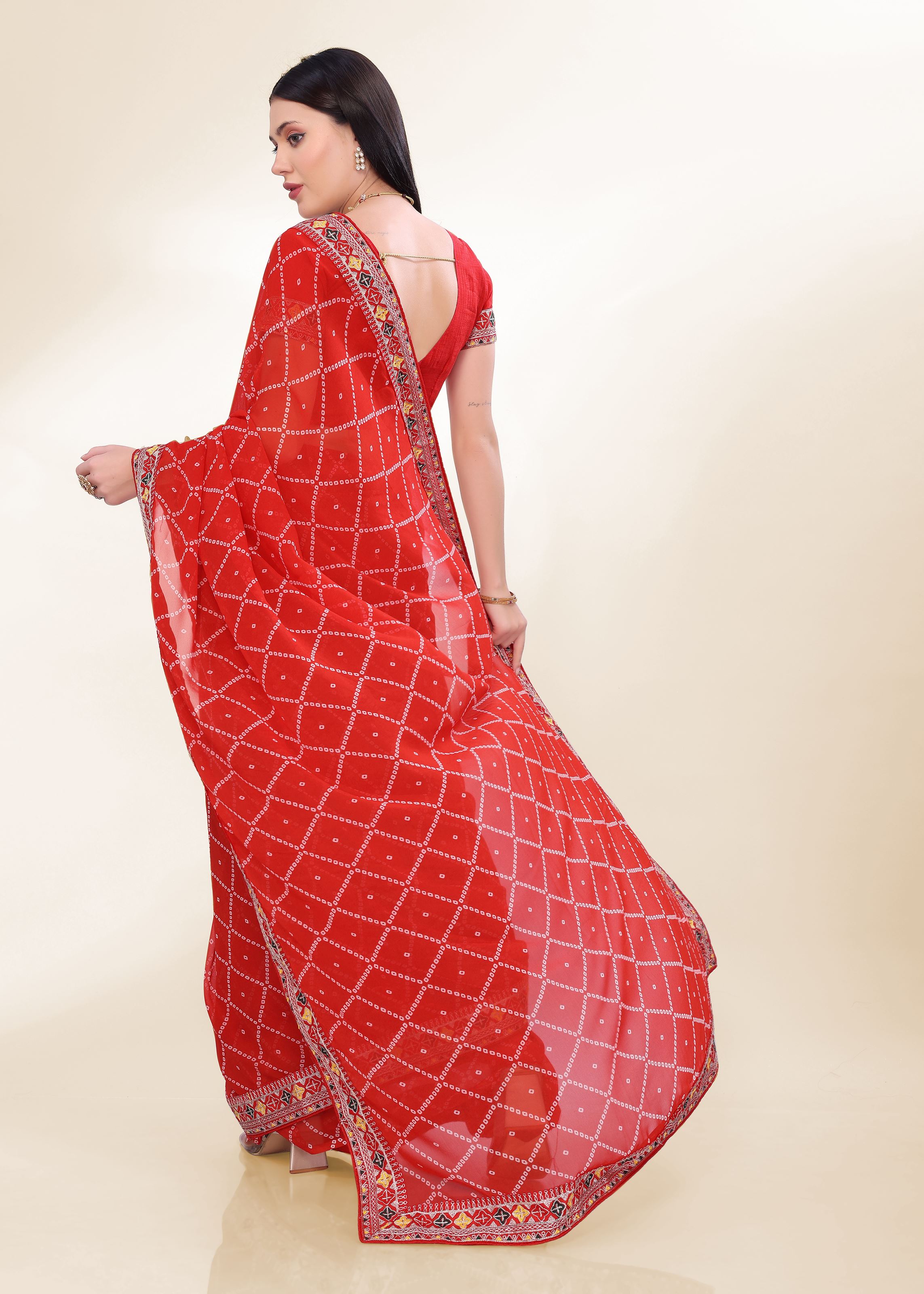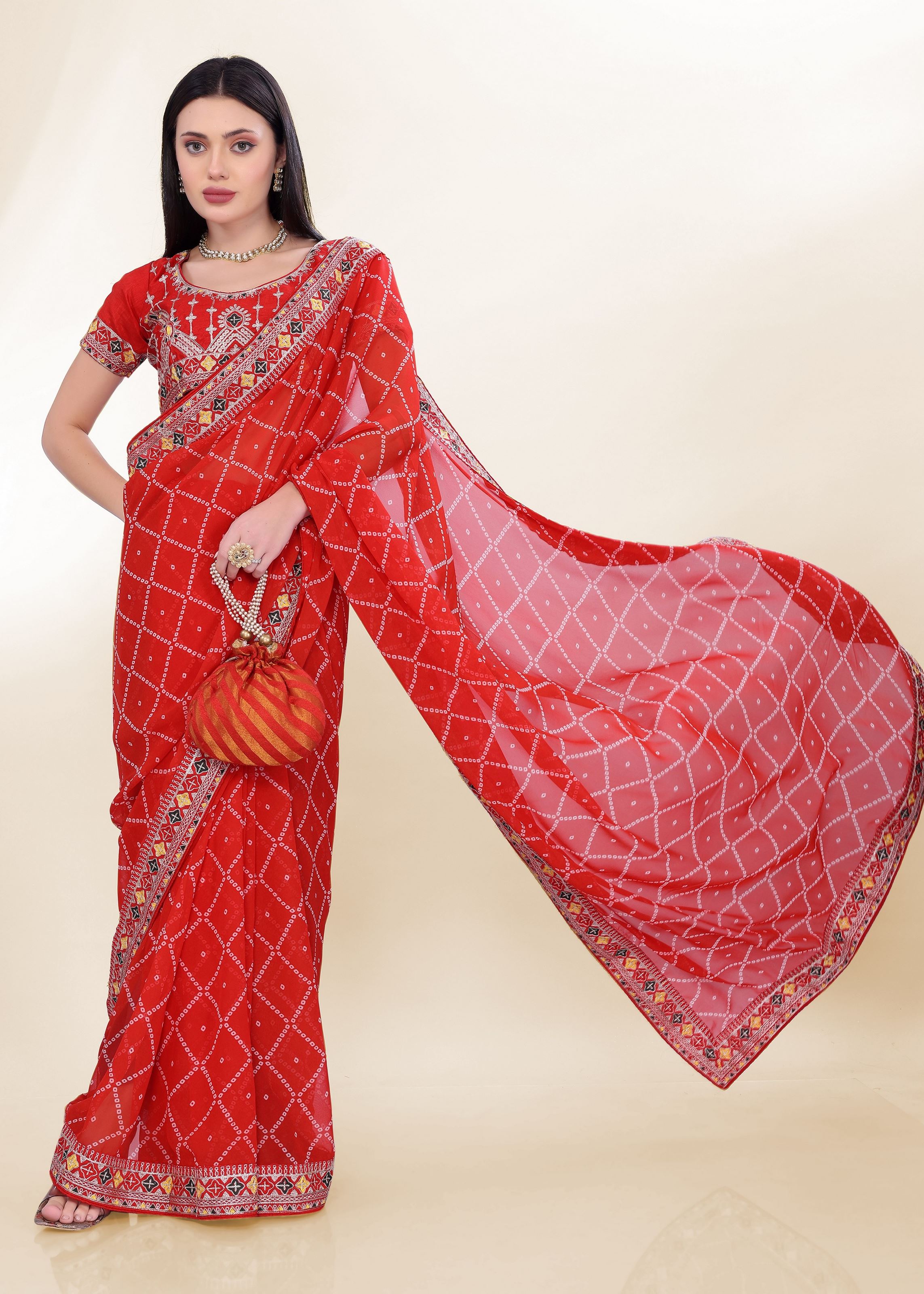Red Georgette Bandhej Printed Saree With Graceful Embroidery Work