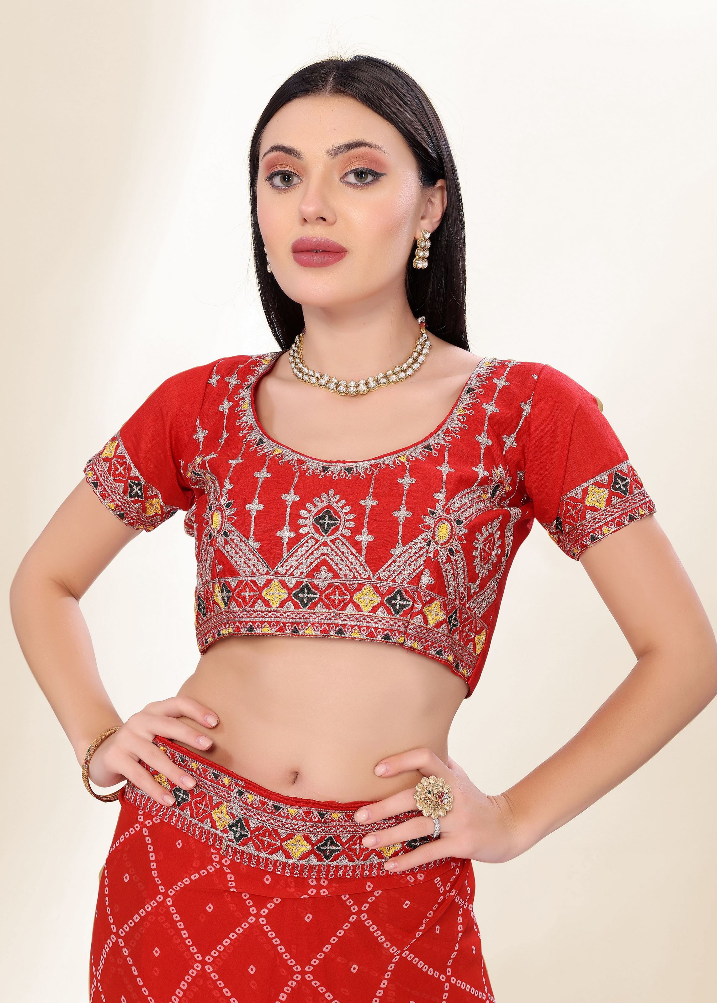 Accompanied by a matching red art silk blouse, this saree creates a cohesive and regal look. Style it with statement jewelry and a pair of embellished heels for a striking ensemble that will turn heads at any event.Perfect for festivals, traditional ceremonies, or evening gatherings, the Red Georgette Bandhej Printed Saree with Embroidery Work is an exquisite blend of heritage and contemporary fashion. Make every occasion memorable with this elegant piece that celebrates Indian craftsmanship at its finest.