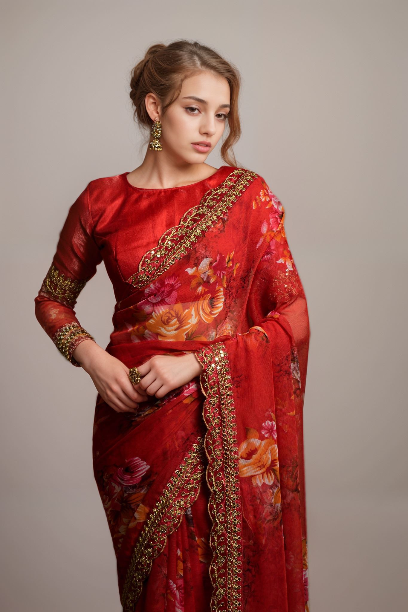 Turn heads at every occasion with the Red Georgette Floral Printed With Embroidered Border Saree from Aethnofit Fashions. Crafted from premium faux georgette, this saree offers a lightweight, flowy drape that enhances your elegance effortlessly. The stunning floral print is beautifully complemented by an intricate embroidered border, creating the perfect blend of grace and glamour.