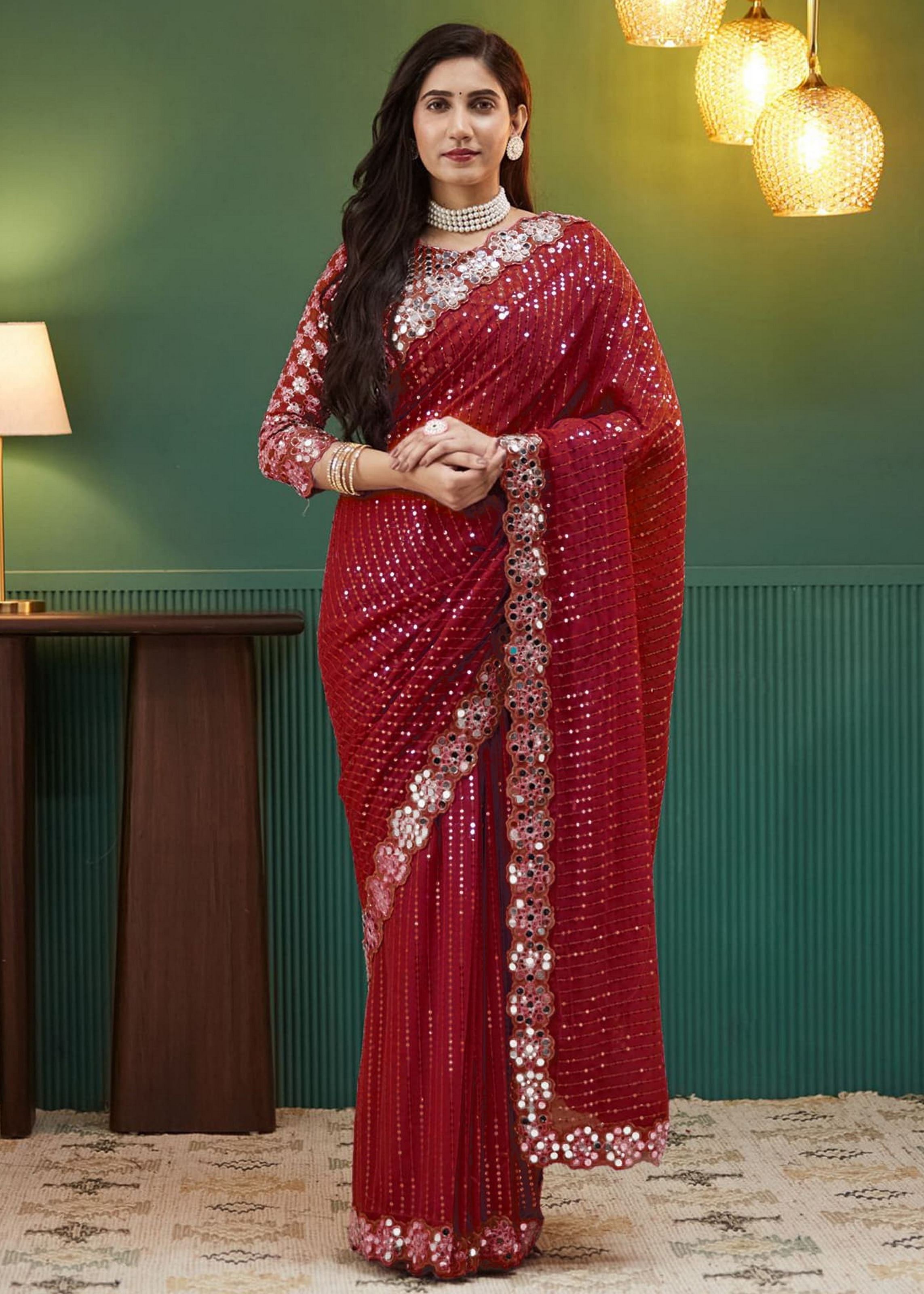 The vibrant red color symbolizes love, passion, and festivity, making it perfect for bridal or ceremonial wear. The saree is adorned with exquisite embroidered detailing, adding richness and a touch of luxury to your overall look. Paired with a matching georgette blouse in red, this ensemble ensures a coordinated and graceful appearance.