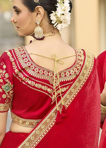 Paired with a matching red blouse in smooth art silk, the ensemble creates a seamless, fiery look that radiates confidence and charm. The art silk blouse adds subtle structure to the outfit, balancing the fluidity of the georgette fabric with a rich, polished appearance.