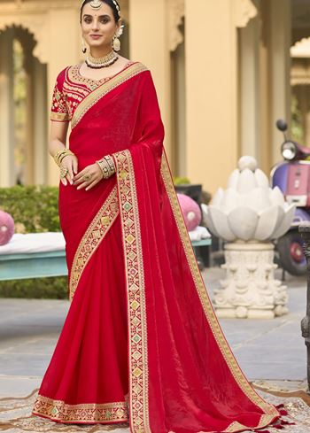 Make a bold and unforgettable statement with Aethnofit Fashions’ Red Georgette Plain Saree With Embroidered Lace Border. This striking red saree, crafted from premium georgette, offers an airy and flattering silhouette. The intricate embroidered lace border adds a sophisticated finish, making it a captivating choice for weddings, receptions, or festive evenings.