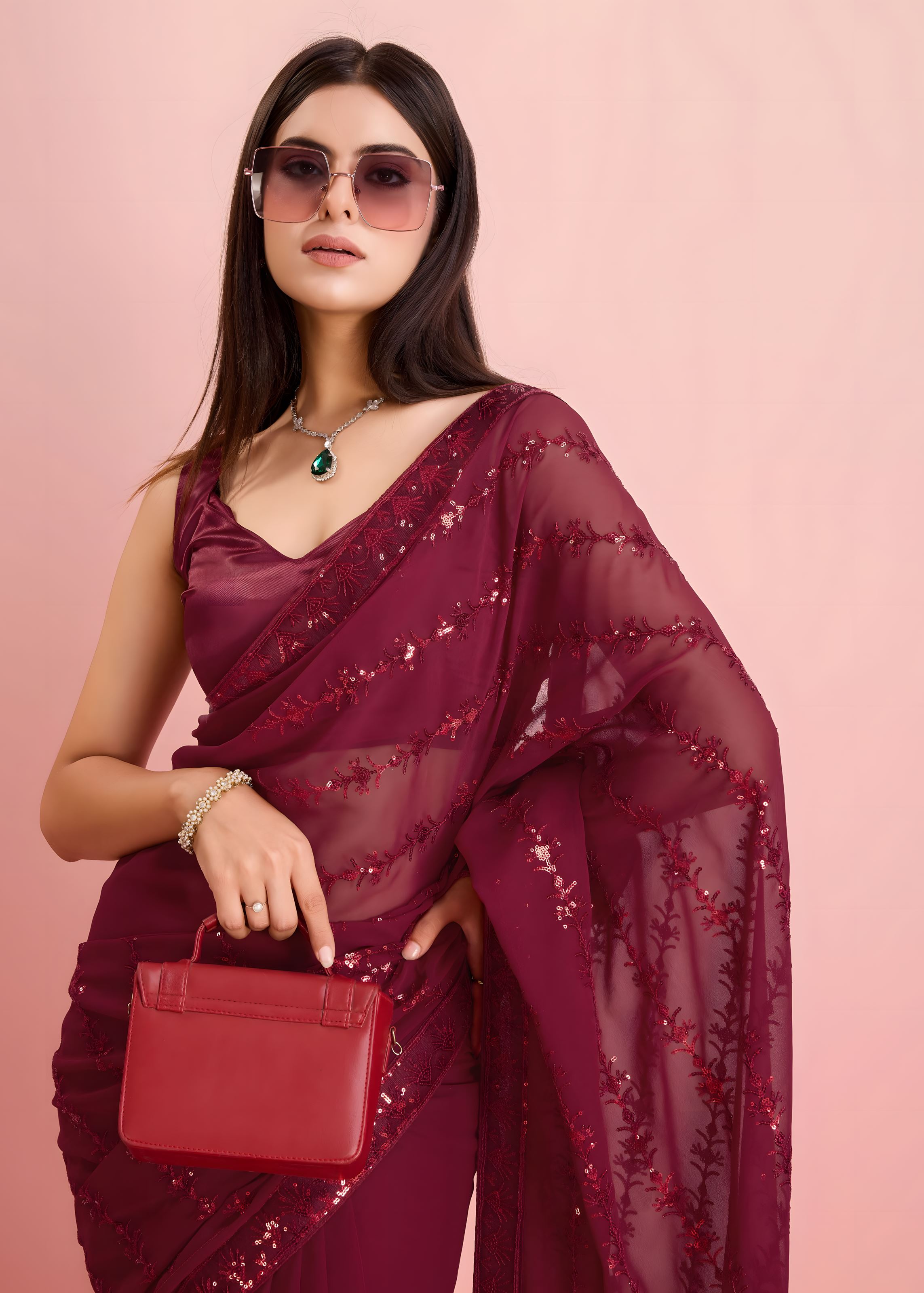 Turn every head your way with Aethnofit Fashions’ Red Georgette Saree—an exquisite creation featuring intricate thread embroidery, delicate 3mm sequins, and a beautifully finished lace border. The bold red hue captures the essence of traditional beauty, making it the perfect choice for weddings, festive occasions, and evening celebrations.
