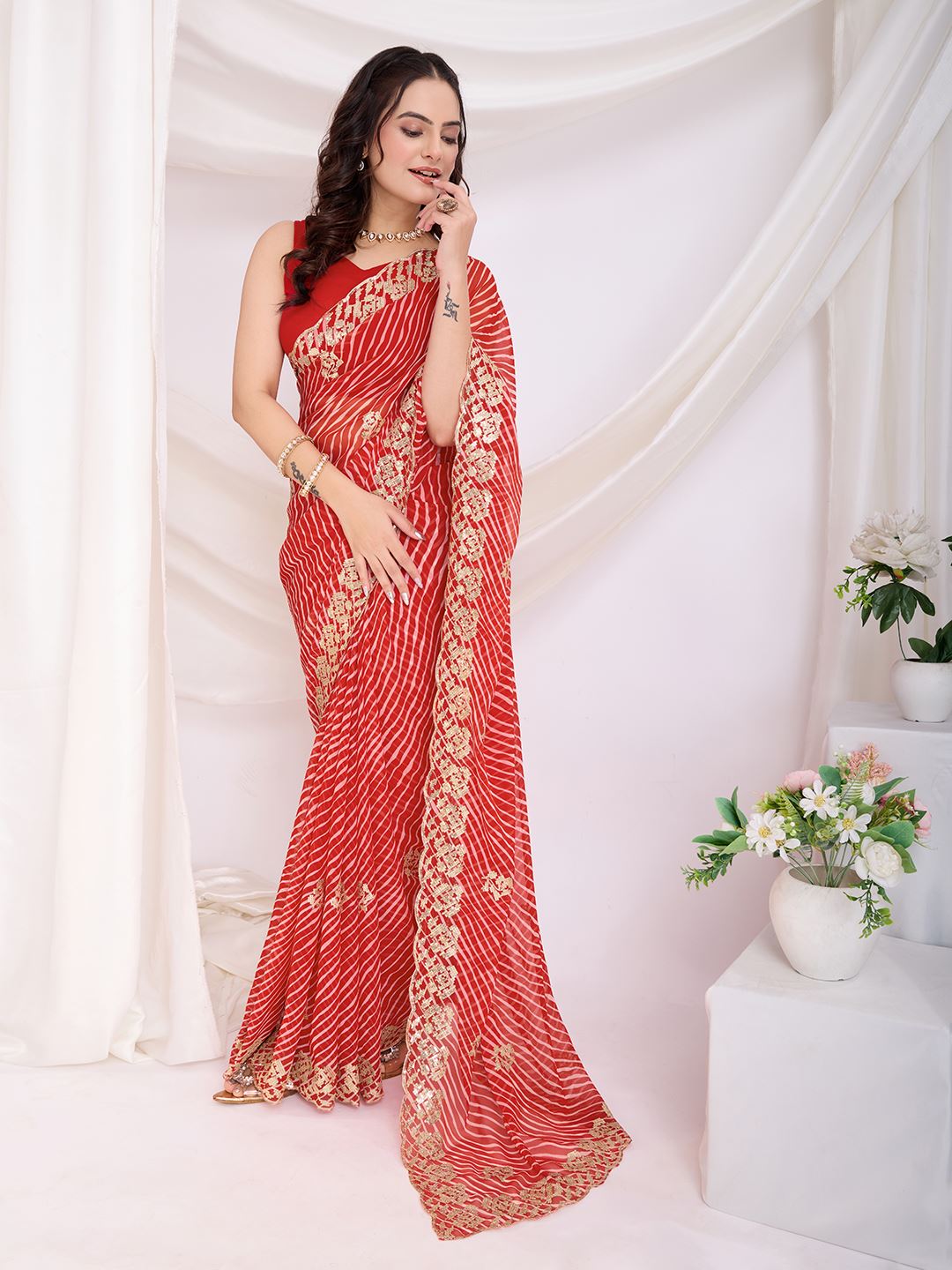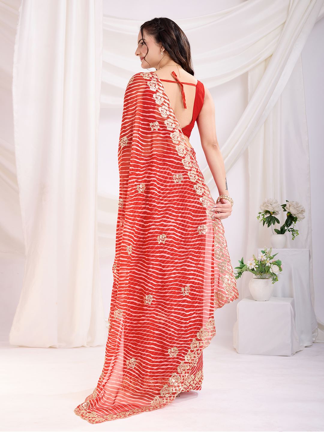 Paired with a matching red art silk blouse, this saree creates a striking silhouette that blends modern glam with traditional grace. The embroidered work adds a refined finish, making it an excellent choice for women who love to embrace designer fashion while staying rooted in cultural elegance. If you are looking to shop Bollywood sarees online, premium georgette party wear, or embroidered designer sarees, this red sequins drape is the ultimate statement piece.
