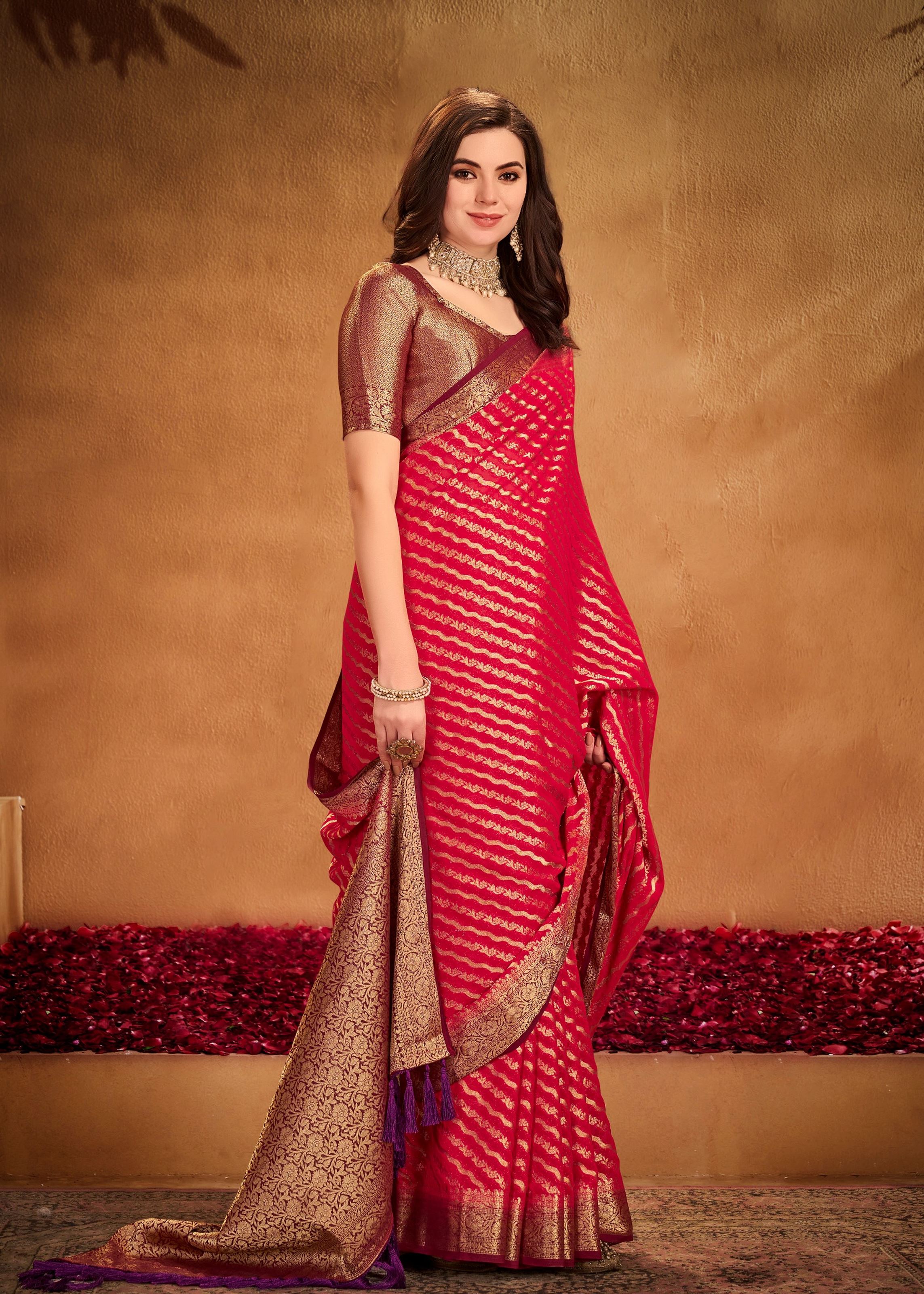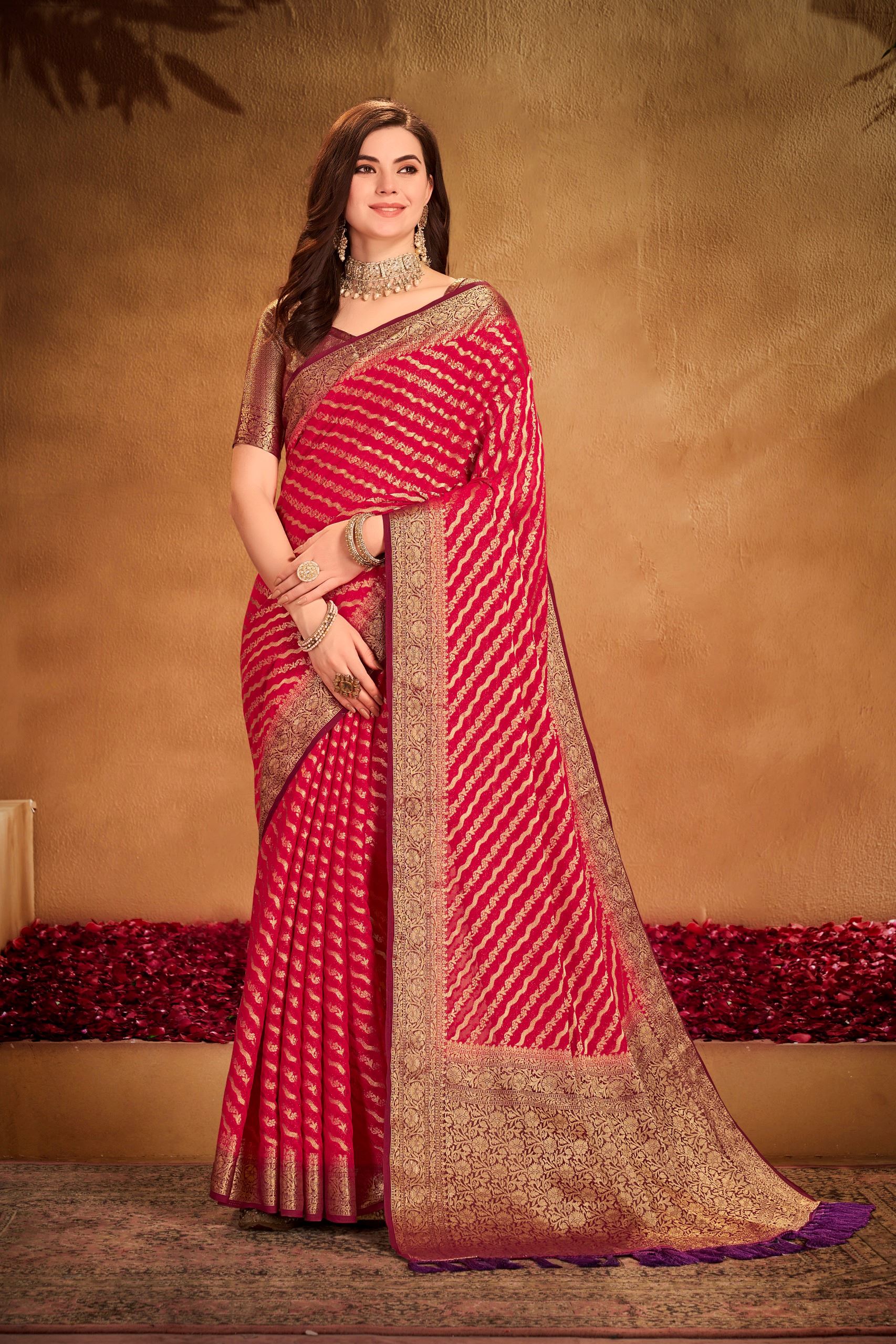 Drape yourself in regal charm with this Red Georgette Woven Designer Saree, an ensemble that embodies grace, tradition, and timeless beauty. Made from lightweight georgette fabric, the saree flows effortlessly, ensuring an elegant drape and unmatched comfort for long hours of wear. The striking red hue symbolizes power, celebration, and festivity, making it an ideal choice for weddings, receptions, festivals, and special parties.