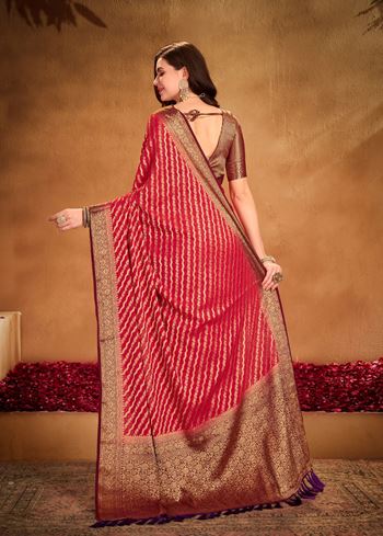 The saree is adorned with fine woven detailing, enhancing its designer appeal with intricate artistry that speaks of heritage craftsmanship. Adding depth and sophistication is the maroon georgette blouse, which perfectly complements the vibrant red saree, creating a harmonious and luxurious contrast. This combination makes the outfit versatile, blending classic elegance with a fashionable twist.