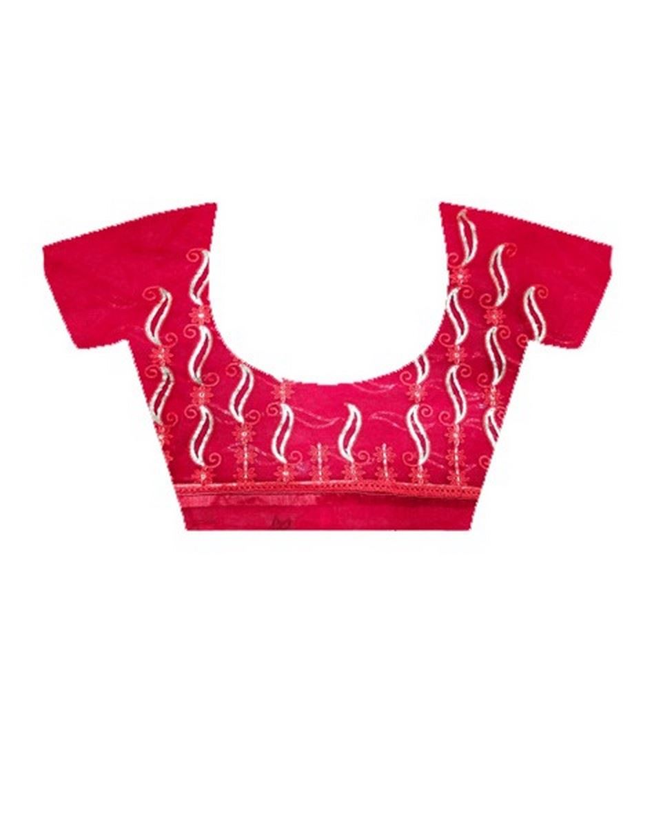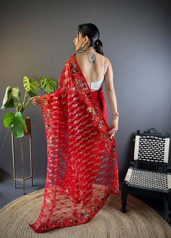 The saree is paired with a matching red net blouse, carefully designed to highlight the intricate embroidery on the drape. Its soft and breathable texture allows for effortless styling and graceful draping. Pair this saree with statement jewelry, chic heels, and a stylish clutch to create a captivating ensemble that balances modern fashion with traditional beauty.