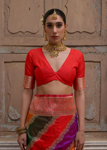 The bold red color represents passion, love, and auspiciousness, making it a timeless favorite for traditional ceremonies. What sets this saree apart is the kadwa weaving technique, a meticulous handloom process where each motif is woven individually instead of using shortcuts. This painstaking method not only enhances the saree’s durability but also gives the designs a rich, embossed effect with unmatched clarity and detail.