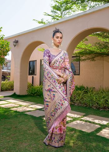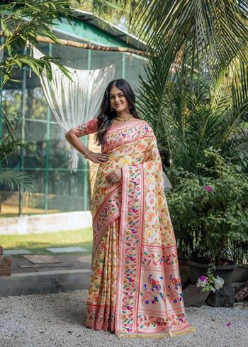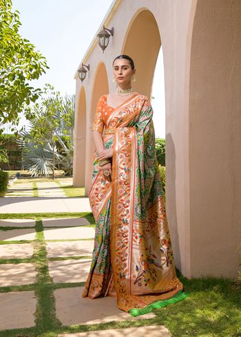 The saree is paired with a contrasting Mahendi green Paithani silk blouse, offering a vibrant yet elegant combination that highlights the richness of the weave. The smooth silk texture and complementary tones enhance the overall appeal, making this ensemble ideal for weddings, traditional functions, or any grand celebration.