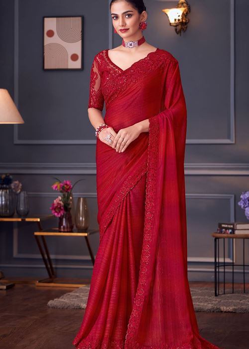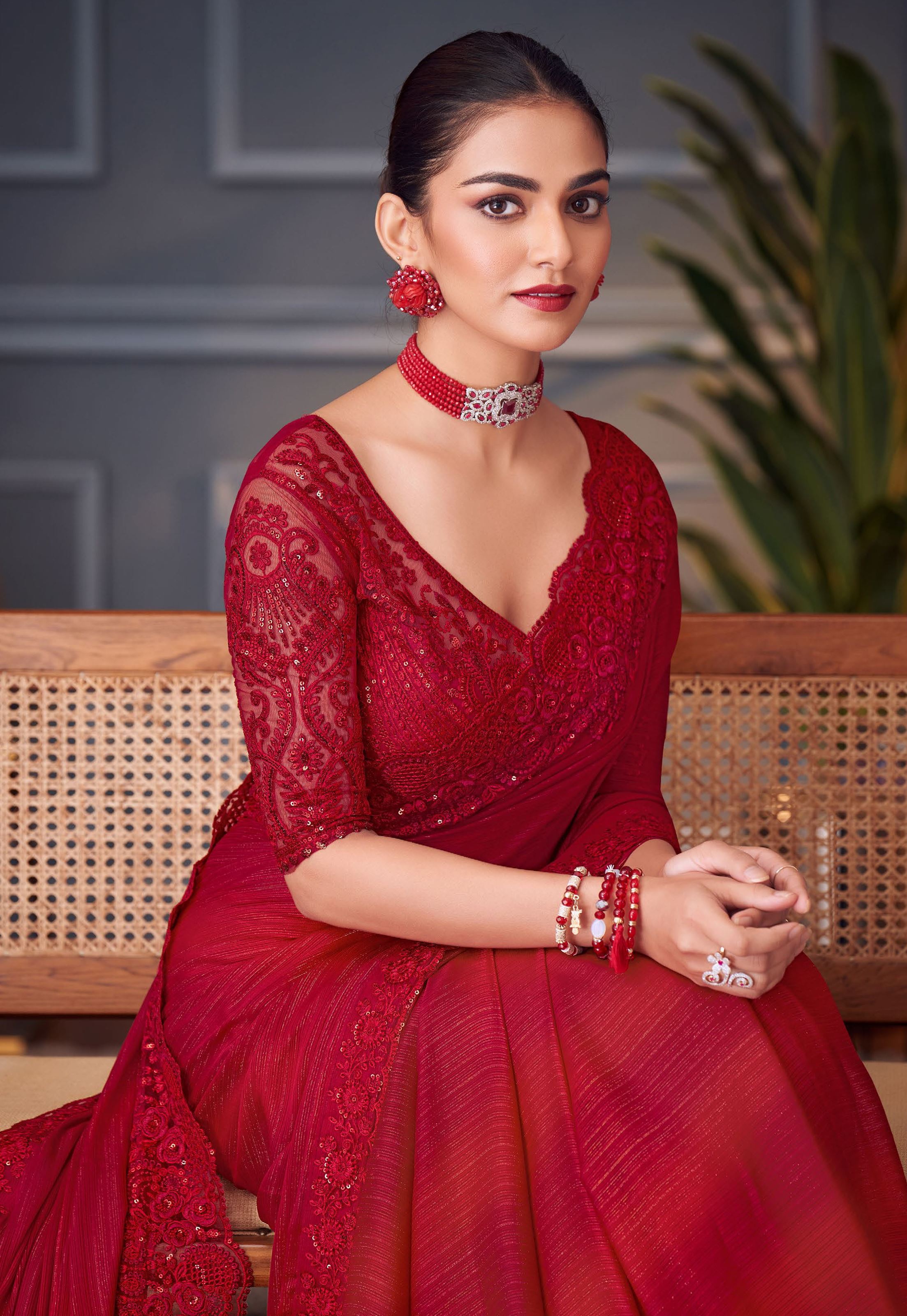 Red Saree With Heavy Thread Embroidery Sequins Work