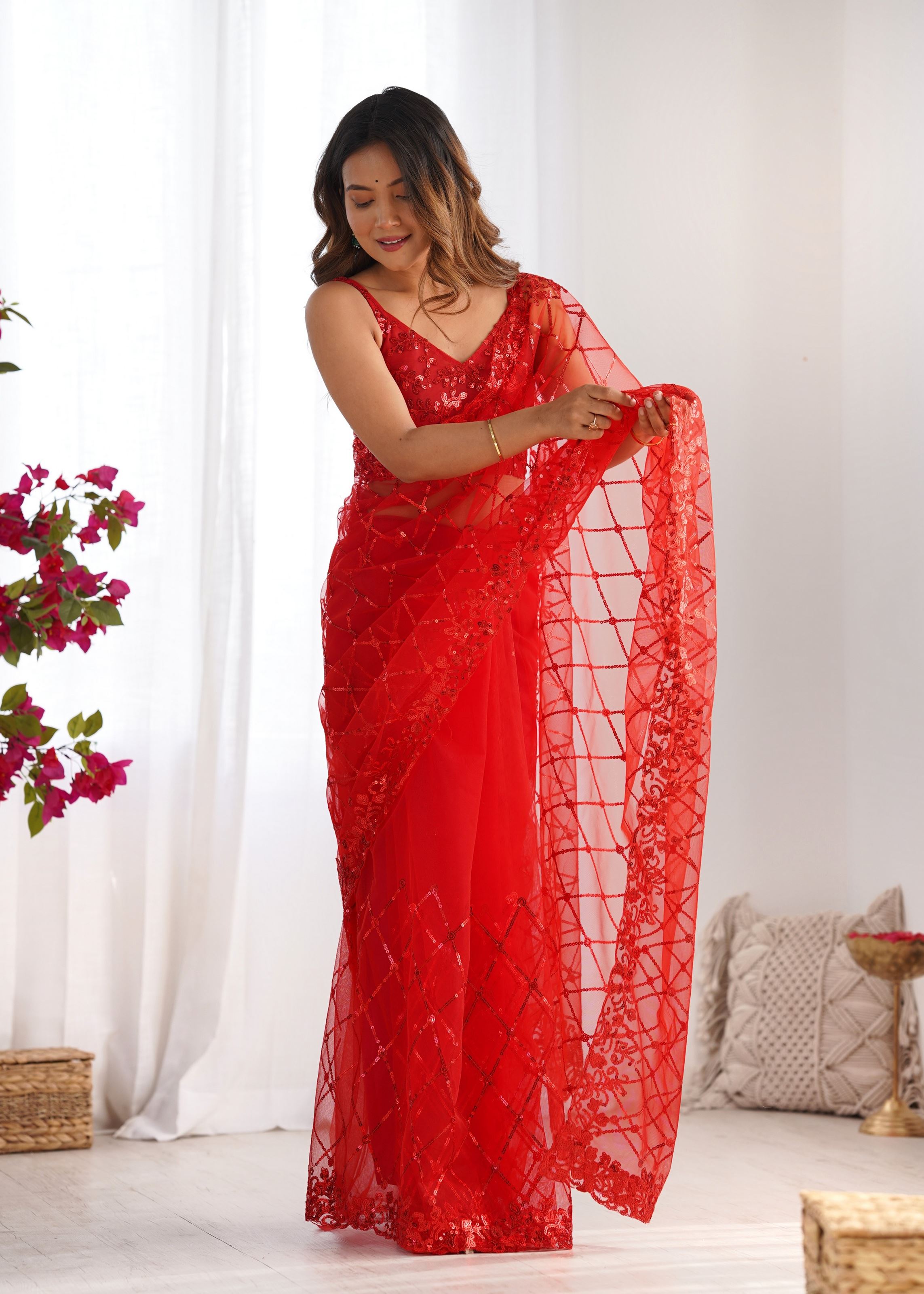 Red Soft Net Designer Sequins Embroidery Work Bollywood Style Saree
