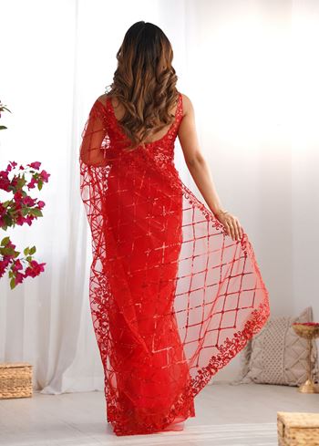 Pair this saree with statement jewelry, elegant heels, and a clutch for a complete Bollywood diva-inspired outfit. Whether you are a wedding guest, attending a cocktail party, or celebrating a festival, this saree ensures you turn heads wherever you go.Shop this Red Soft Net Embroidered Saree with Sequins today and redefine your ethnic style with the perfect blend of tradition and contemporary fashion!