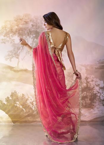 Paired with a golden art silk blouse, this ensemble creates a striking and luxurious contrast. The blouse’s smooth texture and subtle sheen enhance the airy net fabric, delivering a graceful and stylish look. Ideal for Bollywood-inspired partywear sarees, evening events, and bridal celebrations, this designer piece allows you to make a statement with timeless elegance and modern appeal.
