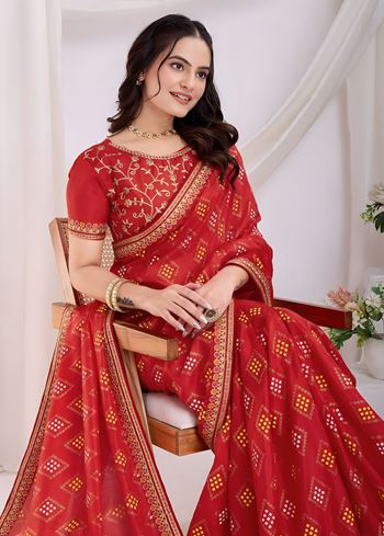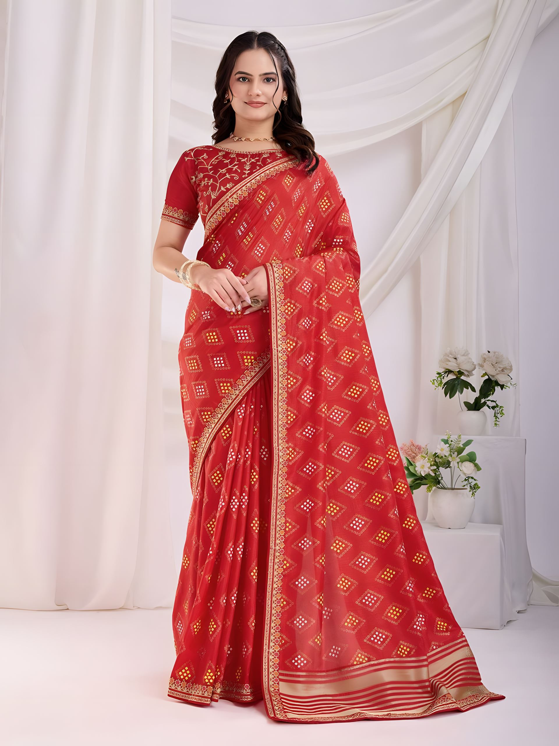 Red Vichitra silk Saree with Golden Foil bandhani print with embroidery work lace