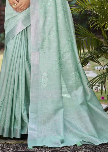 The matching sea green linen blouse completes the ensemble, providing a coordinated and sophisticated look. Its soft texture ensures comfort for extended wear, while the saree’s graceful fall adds a touch of refinement to your overall appearance. Perfect for those who appreciate understated elegance, this saree seamlessly blends traditional design with modern sensibilities.