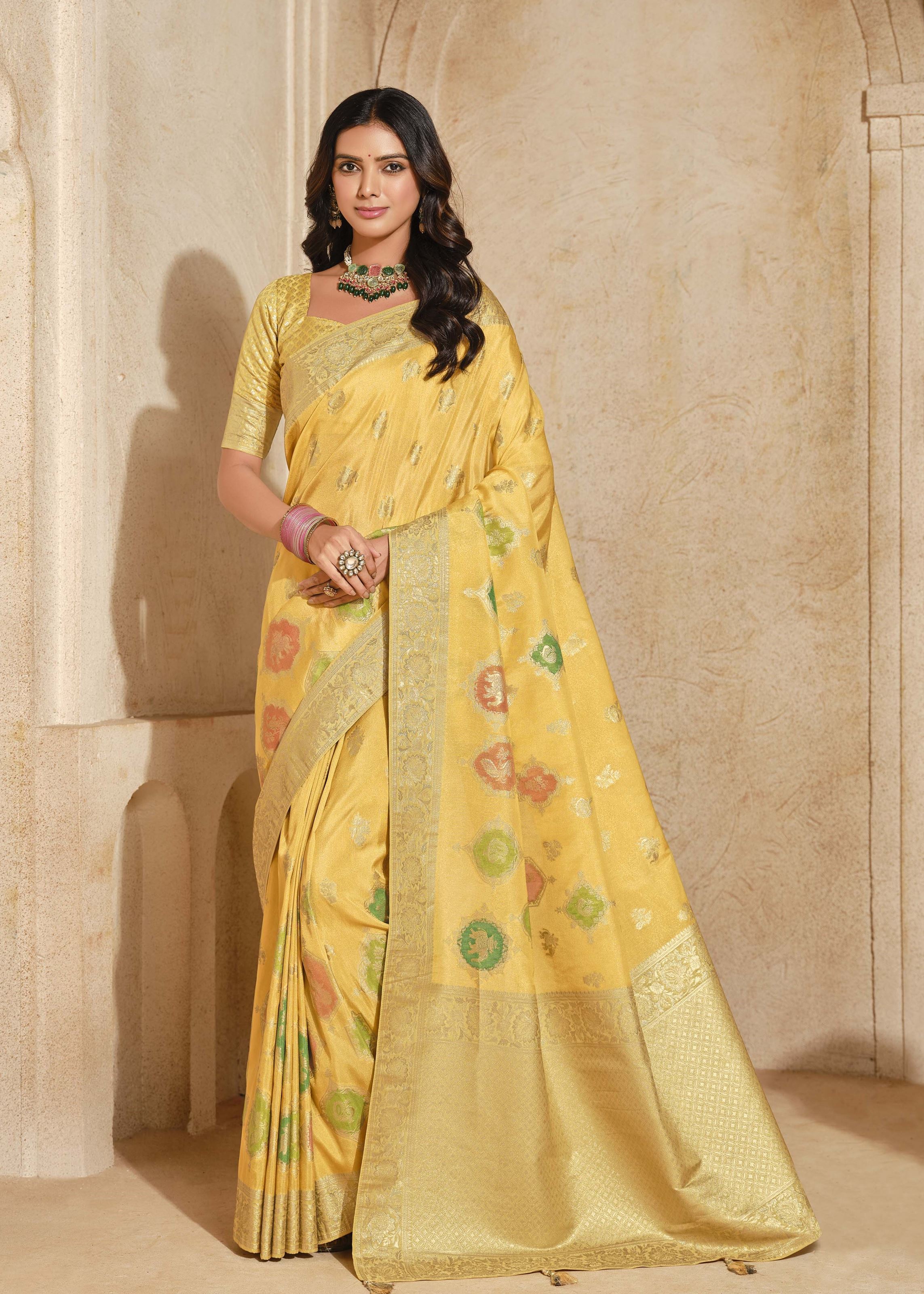 Rich And Heavy Woven Jari Designer Yellow Partywear Silk Saree