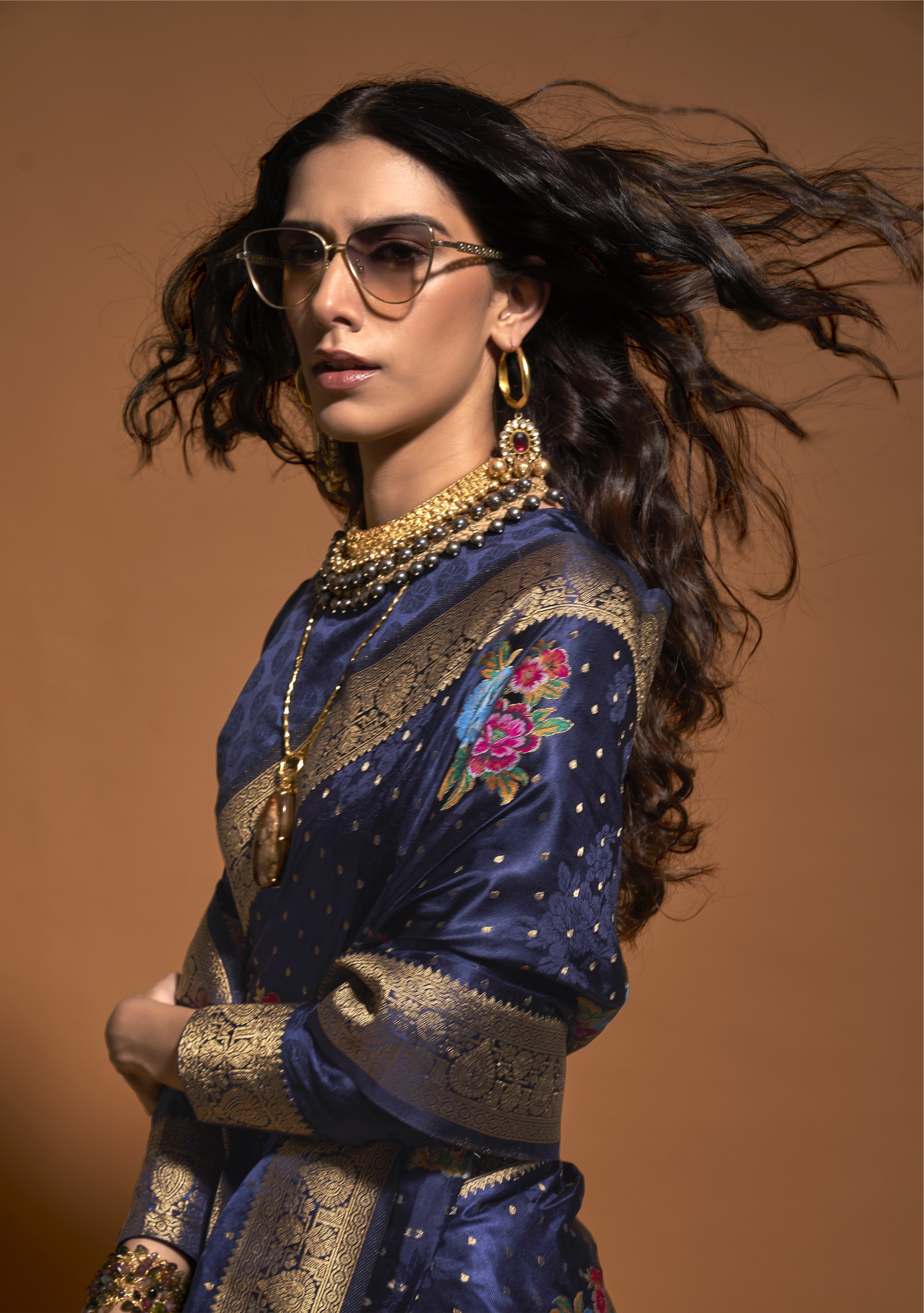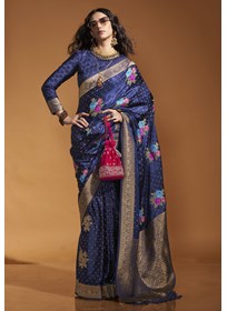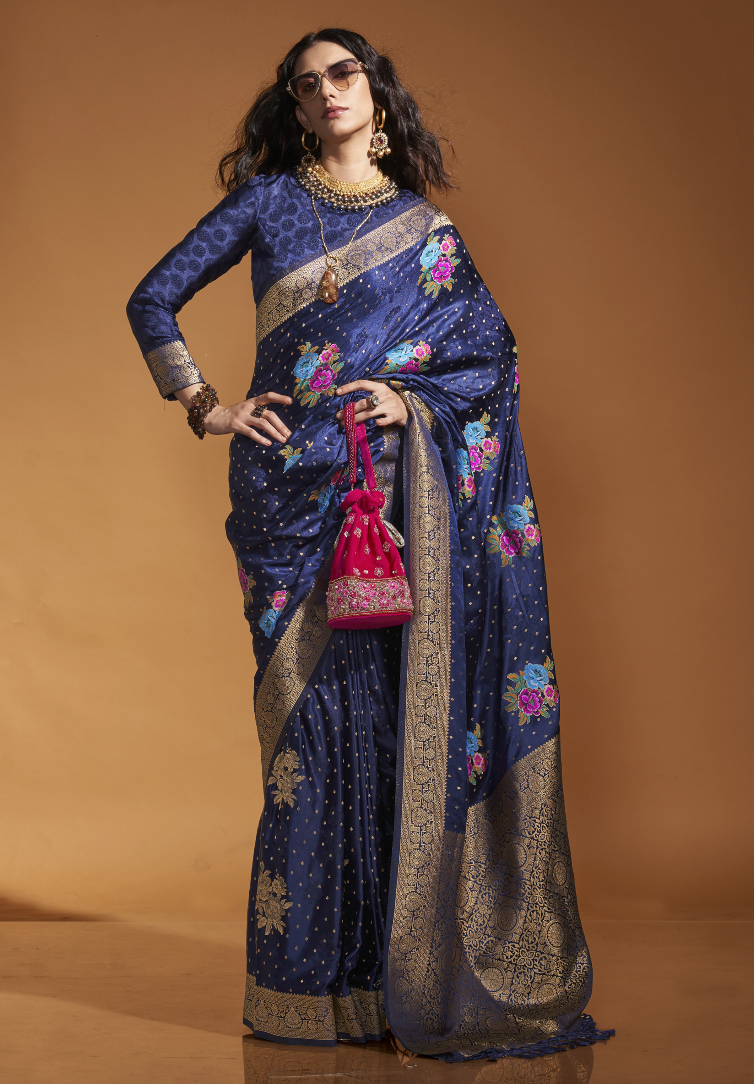 Royal Blue Multi Color Flower Jacquard Woven Saree
