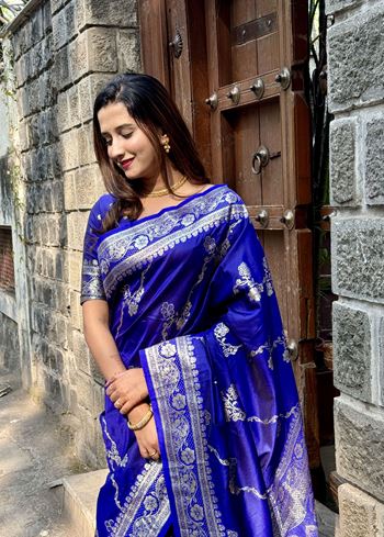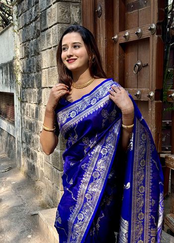 Paired with a matching royal blue silk blouse, this saree ensures a coordinated and elegant look. The lightweight yet rich Banarasi silk fabric drapes effortlessly, offering all-day comfort while enhancing your festive-ready silhouette. Accessorize with statement jewelry, elegant heels, and ethnic accessories to create a standout ensemble that captures attention at any celebration. Designed for women who value authentic silk artistry, this saree beautifully merges tradition, opulence, and contemporary style.