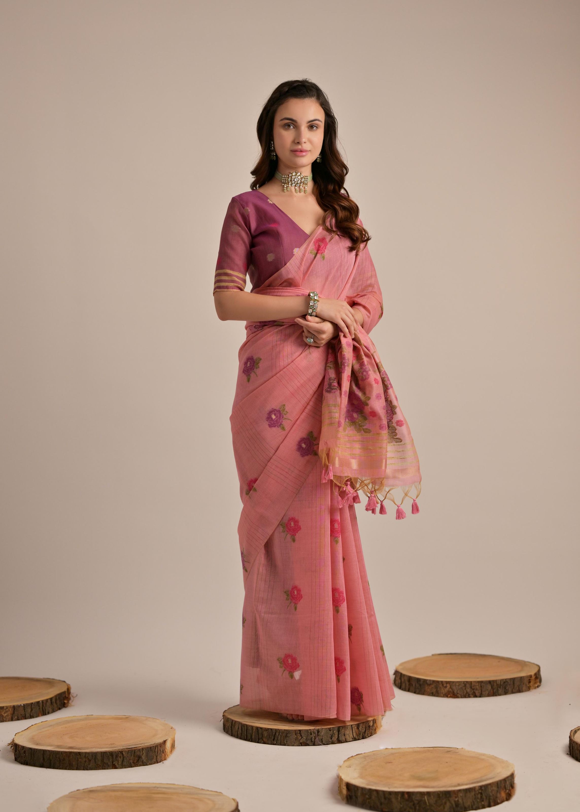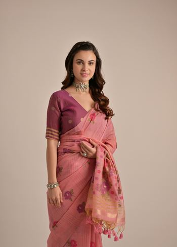 Infuse your wardrobe with charm and grace with this Rust Beautiful Girly Looks Multy Floral Weaving Designer Muga Cotton Saree from Aethnofit Fashions. Expertly crafted from blended cotton, the saree carries the richness of muga cotton while remaining soft, breathable, and comfortable to drape. The rust-colored body is adorned with multi-floral woven motifs that radiate vibrancy and artistic finesse. It comes paired with a contrasting maroon blended cotton blouse, adding depth and sophistication to the overall look.