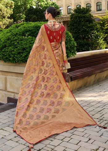The saree features intricate woven jacquard patterns, reflecting the artistry of traditional weaving techniques that add a luxurious touch to its overall appeal. Designed to bring out a perfect balance of tradition and modernity, it ensures you make a statement wherever you go.