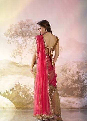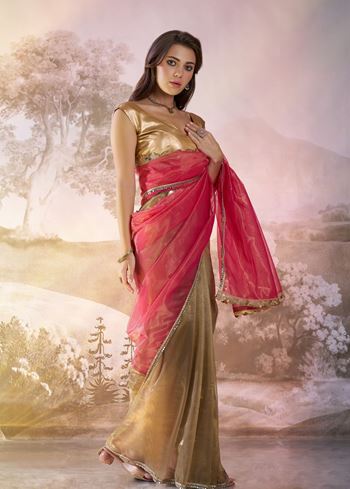Paired with a golden art silk blouse, the ensemble achieves a vibrant and luxurious contrast. The blouse’s smooth texture and lustrous finish complement the airy net fabric, enhancing the saree’s graceful appeal. Perfect for Bollywood-inspired partywear sarees, evening events, or bridal celebrations, this designer piece ensures you make a stylish and memorable statement at any occasion.